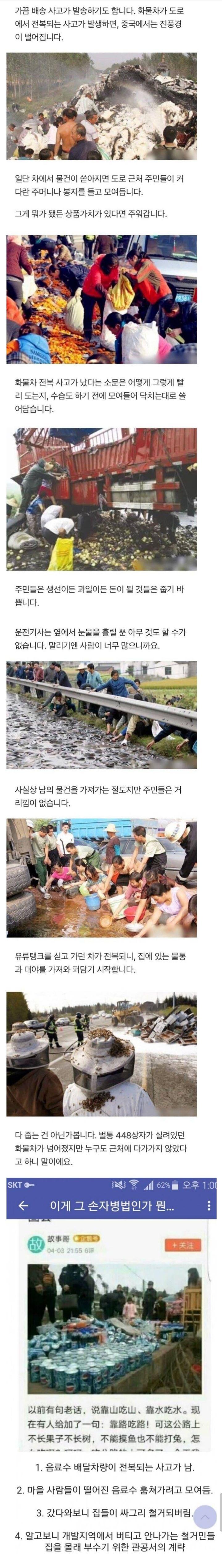 어떻게 해야 되는지 몰라 당황스러웠지만 다들 마을에서 그런 일이 빈번하게 발생하기 때문에 긴장감이 없는 것 같습니다. 사고로 인해 떨어진 물건들 가운데 상품 가치가 있는 것들은 주민들이 주워갑니다. 특히 생선이나 과일 같은 것들은 돈이 될 것 같아 빠르게 줍습니다. 운전기사들은 이런 상황에서 아무것도 할 수 없어 눈물을 흘리고만 있습니다. 주민들이 너무 많아서 말리기 어려운 것도 한몫합니다. 이런 행동은 사실 절도에 해당하지만 주민들은 그렇게 생각하지 않습니다. 사고 소문이 퍼지면 아무도 기다리지 않고 다 모이는데, 아직 수습도 되기 전에 닥치는 대로 주변 것들로 쓸어버리기 시작합니다. 벌통 448 상자가 떨어져 있지만 근처에 다가가는 사람은 없다고 합니다. 이건 SKT라는 소원이 있다고 하더군요. 마치 마을에 있던 옛날 이야기처럼, 산은 산물을 먹고 물은 물을 먹는다고 하죠. 하지만 이제는 마을 사람들은 "누구든 그 길을 먹는다"라는 소리를 하게 되었습니다. 개발지역에서 버티고 안나가는 집을 몰래 관계자들이 감시하려고 하기도 했는데, 마을 사람들이 모여 붙잡아 버렸습니다. 이렇게 되면 더 이상 훔쳐갈 수 없겠군요.
