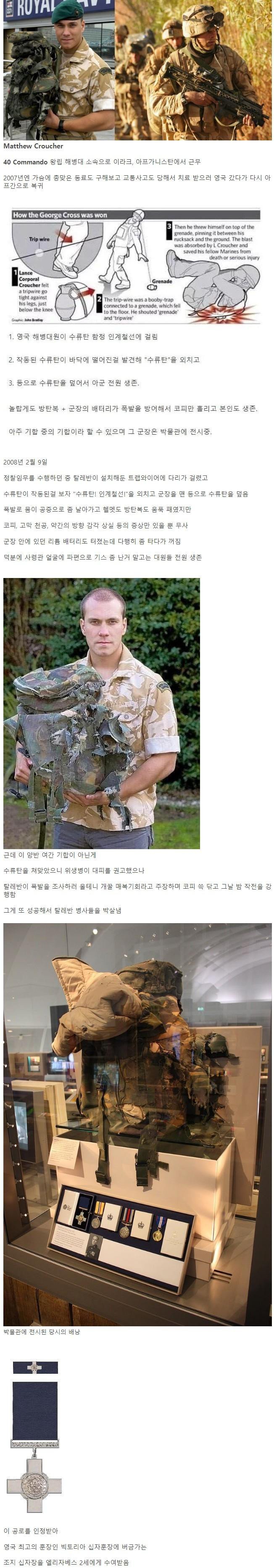 이 공로를 인정받아, Matthew Croucher는 영국 최고의 훈장 중 하나인 Victoria Cross를 받았습니다. 그의 운이 좋았기도 했지만, 그의 상태와 결실을 보면 사실 그는 인정받을 만한 기민함과 용기를 갖고 있었습니다.