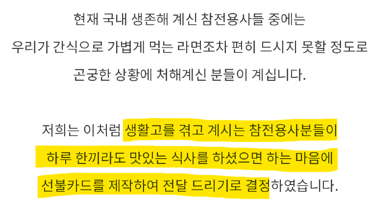 - 현재 생존해 있는 참전용사들 중에는 라면을 편히 먹지 못할 정도로 곤궁한 상황에 있는 분들이 있다고 언급함.