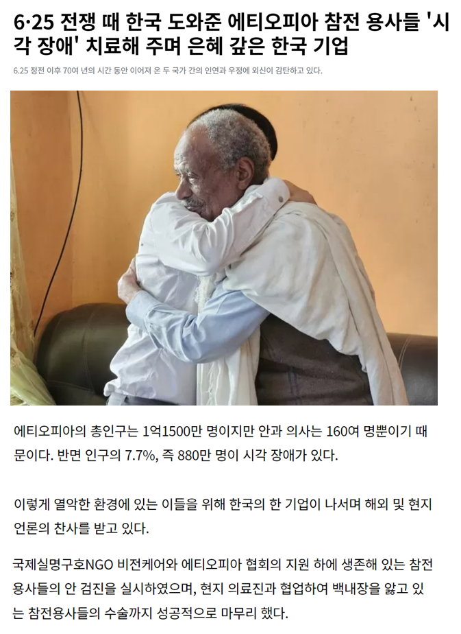 - 에티오피아 참전용사들에게 시각 장애 치료를 제공한 한국 기업에 대한 외신의 감탄