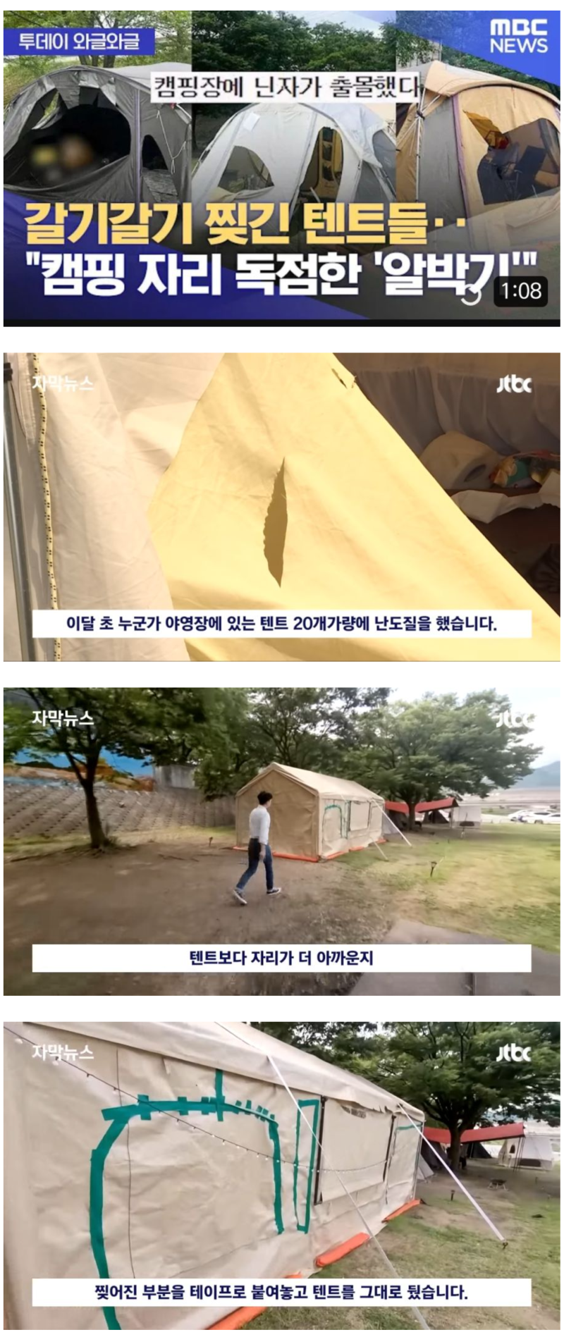 MBC NEWS에 따르면, 야영장의 텐트들에는 약 20개에 달하는 찢긴 흔적이 보였습니다. 이 찢긴 부분은 테이프로 조금씩 붙여놓은 상태로 방치되어 있었습니다. 이로 인해 야영객들은 더 이상 신청할 수 없는 자리가 되었고, 꽤나 골치 아픈 상황에 놓여졌습니다.