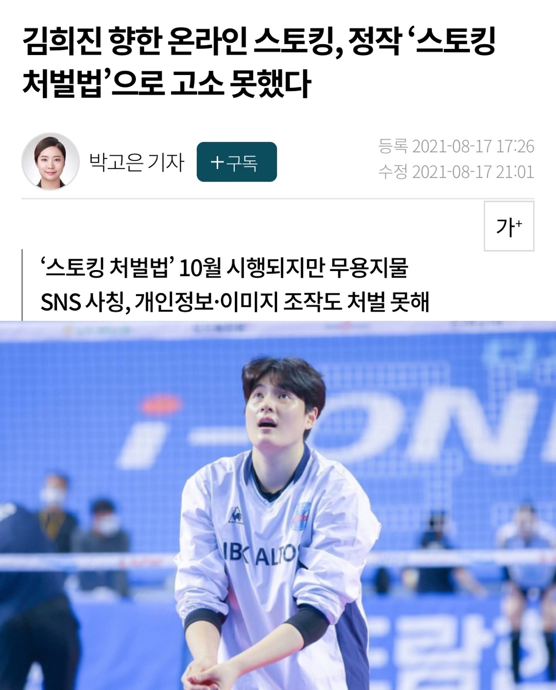 김희진에 대한 온라인 스토킹은 계속되고 있지만, 현재의 '스토킹 처벌법'은 적용되지 않고 있다. 스토킹 범죄에는 '반의사불벌죄'라는 법적 효력이 없어져야 한다는 투표 결과가 나왔다. 10월에 시행되는 '스토킹 처벌법'은 실질적인 처벌을 할 수 없어 SNS 사칭이나 개인정보, 이미지 조작 등도 처벌할 수 없게 되었다. 이에 이수정 경기대 범죄심리학과 교수는 "스토킹 가해자는 정상적인 사고가 불가능한 상태"라며 가해자의 인권만을 보호하는 것에 대해 비판했다. 그는 "감시의 대상이 잘못된 것 같다. 스토커를 감시하는 것이 아니라, 스토킹 피해자를 감시하는 제도를 운영하다 보니 스토커는 대낮에 피해자를 감시할 수 있지만 그것을 제재할 수 없다"고 강조했다. 스토킹 범죄가 증가하고 있는 가운데 '전자발찌 부착 추진'도 제안되고 있다. 또한 김지 법무장관은 '스토킹 처벌법' 개정안에 대한 브리핑을 진행했으며, 한동훈 법무부 장관은 스토킹 범죄 관련 법제 정비에 만전을 기할 것을 선언했다. 스토킹 피해가 어렵게 파악되는 상황에서 건전한 성 공감대를 형성하는 것은 어려운 과정이지만, 스토킹에 희생당한 피해자의 마음을 이해하고 더 나은 법정 안에서 보호할 수 있는 제도를 만들어야 한다.