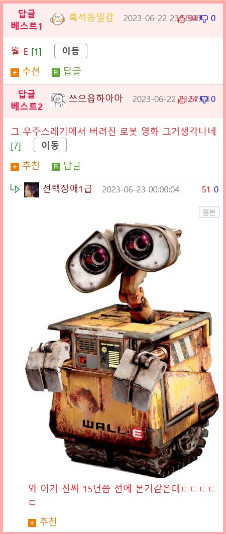 마지막 답글에서는 WALLE라는 우주 로봇 영화에 대한 언급이 나오며, 작성자는 LD 선택장애1급이고, 이 답글은 2023년 6월 23일에 올라온 글입니다. 또한, 이 답글에는 0개의 추천이 있습니다.