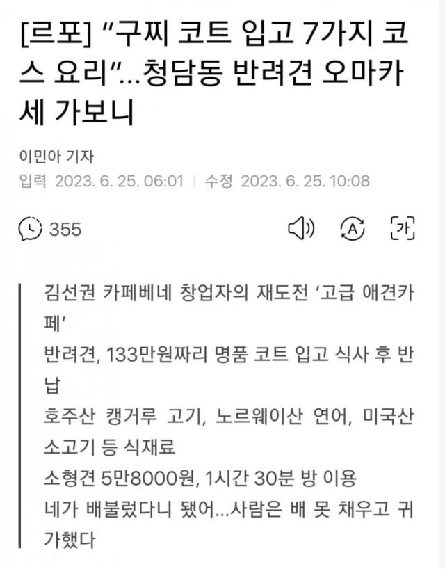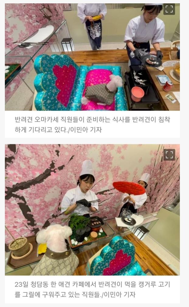 2023년 6월 25일, 청담동에 위치한 반려견 카페에서는 구찌 코트를 입고 온 7가지 코스 요리를 즐길 수 있다고 한다. 이 카페는 카페베네 창업자인 김선권의 재도전으로, 고급 애견카페로 알려져 있다. 이 반려견 카페에서는 반려견들을 위해 133만원의 명품 코트를 지원하며, 식사를 한 후에는 반려견을 다시 반납한다고 한다. 식사에는 호주산 캥거루 고기, 노르웨이산 연어, 미국산 소고기 등의 고급 식재료가 사용되며, 소형견을 위한 메뉴는 5만8000원에 제공된다. 또한, 반려견들은 1시간 30분 동안 방을 사용할 수 있으며, 배부르지 않은 반려견들을 위해 맛있는 식사 제공을 위해 노력하고 있다.