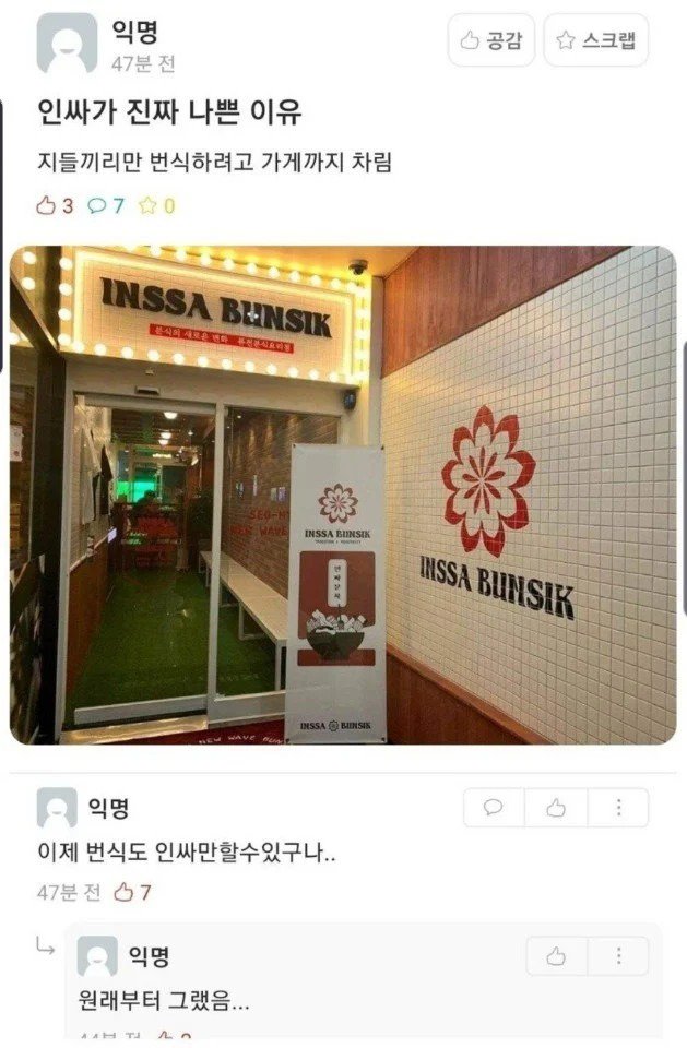 이 글은 인싸들의 나쁜 점에 대해 이야기하고 있습니다. 글쓴이는 인싸들이 자기들끼리만 번식하려고 가게까지 차리고 있다고 말하고 있습니다. 인싸들은 번식도 인싸들끼리만 할 수 있다고 댓글을 쓰고 있습니다. 또 다른 댓글에서는 아싸들을 처단하기 위해 '아싸의 신'이라는 말을 사용하며, 행방식의 휴식을 이용하여 처단한다고 제안하고 있습니다. 또 다른 댓글에서는 유부초밥에 실망한다고 말하며, 공감과 스크랩을 받았습니다.