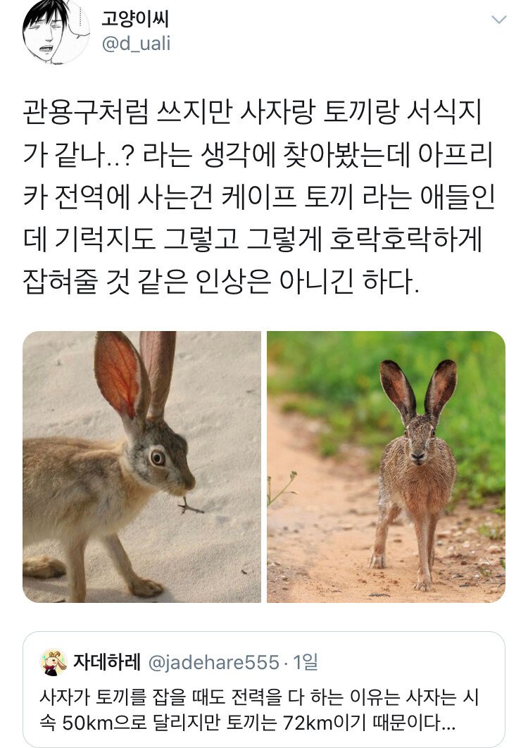 사자와 토끼는 생긴 것도 서식지도 다르지만 사는 곳도 달라서 사실 관용구처럼 사용되지만 같은 곳에서 사는 것은 아니라고 한다. 아프리카에서 사는 토끼는 케이프 토끼라고 하는데, 그들은 기럭지도 그렇고 사자한테 잡힐 가능성이 높지 않다. 사자가 토끼를 잡기 위해 힘을 다하는 이유는 사자는 시속 50km로 달릴 수 있는데, 토끼는 72km로 더 빨리 달릴 수 있기 때문이라고 한다.