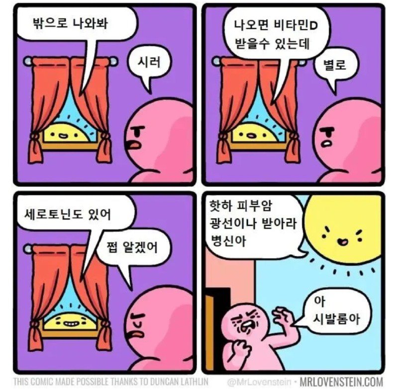이 글은 밖으로 나와서 세로토닌을 즐기세요. CD를 듣고 시련을 얻을 수도 있지만 어쩌면 이 만화는 던컨 래슬린 덕분에 가능한 것이다. 댓글을 써주신 샹썅샹님에게 감사드립니다. 이 글은 2023년 7월 8일 16시 12분 33초에 작성되었으며 베스트1에 선정되었습니다. 병신아가 웃긴 이야기를 가져왔네요. 니가 불러냈다니까요! 답글을 달면 비타민 D를 얻을 수 있는데, 핫하게 피부암 광선을 받아라 병신아. Po 아 시발롬아, MrLovenstein의 MRLOVENSTEIN.COM에서 확인하세요.