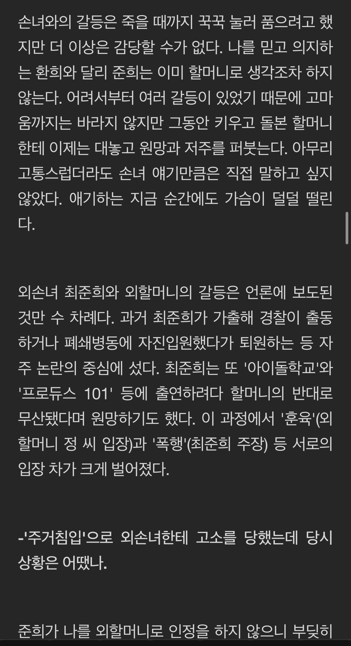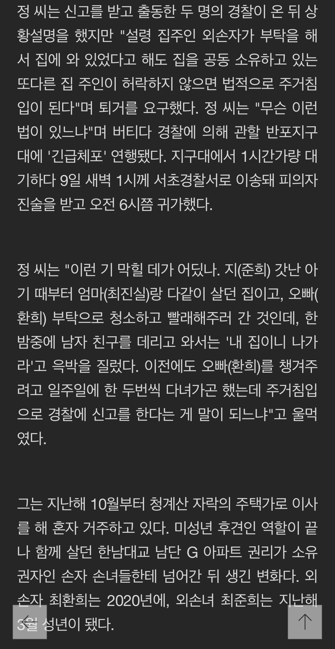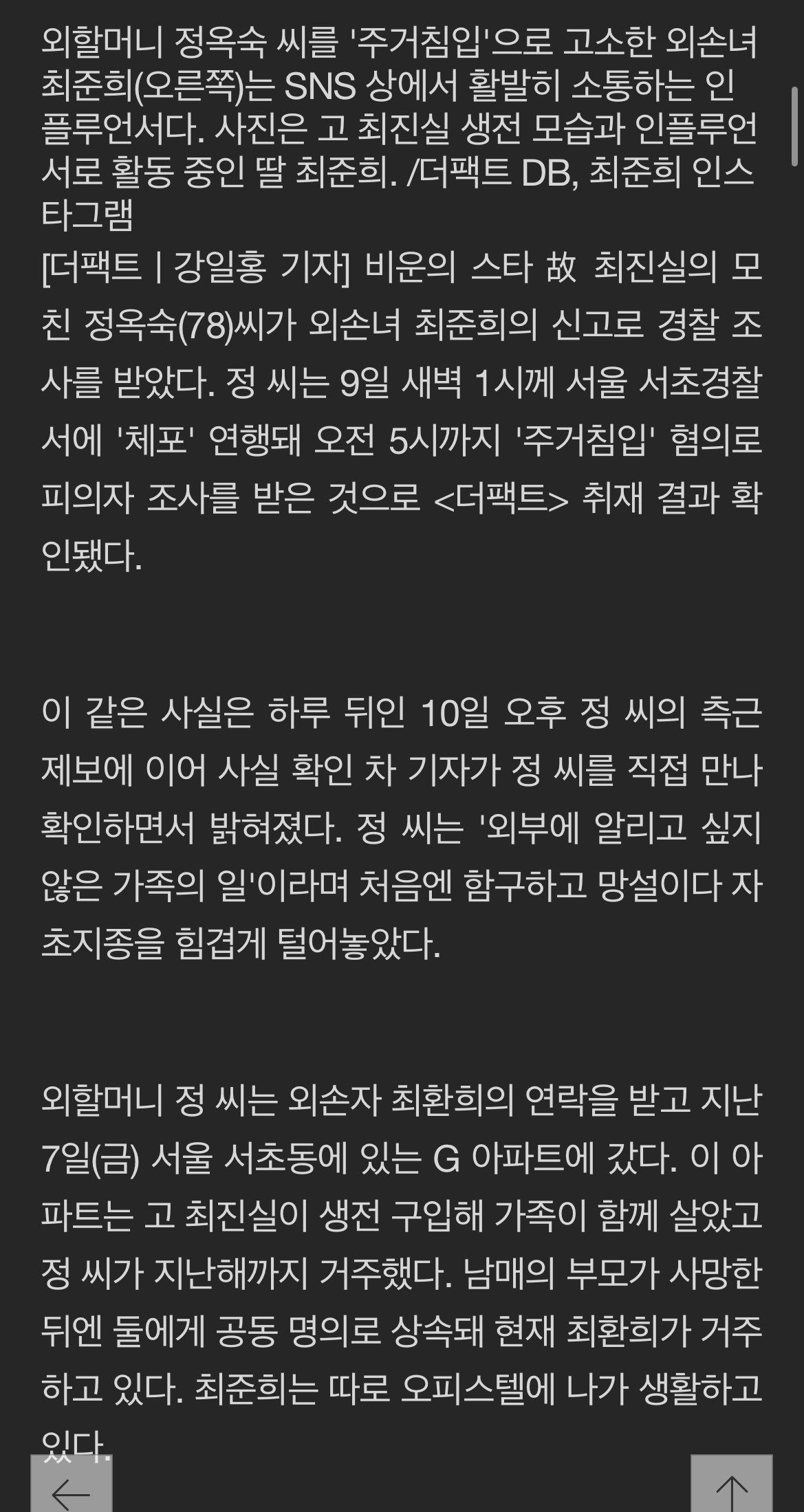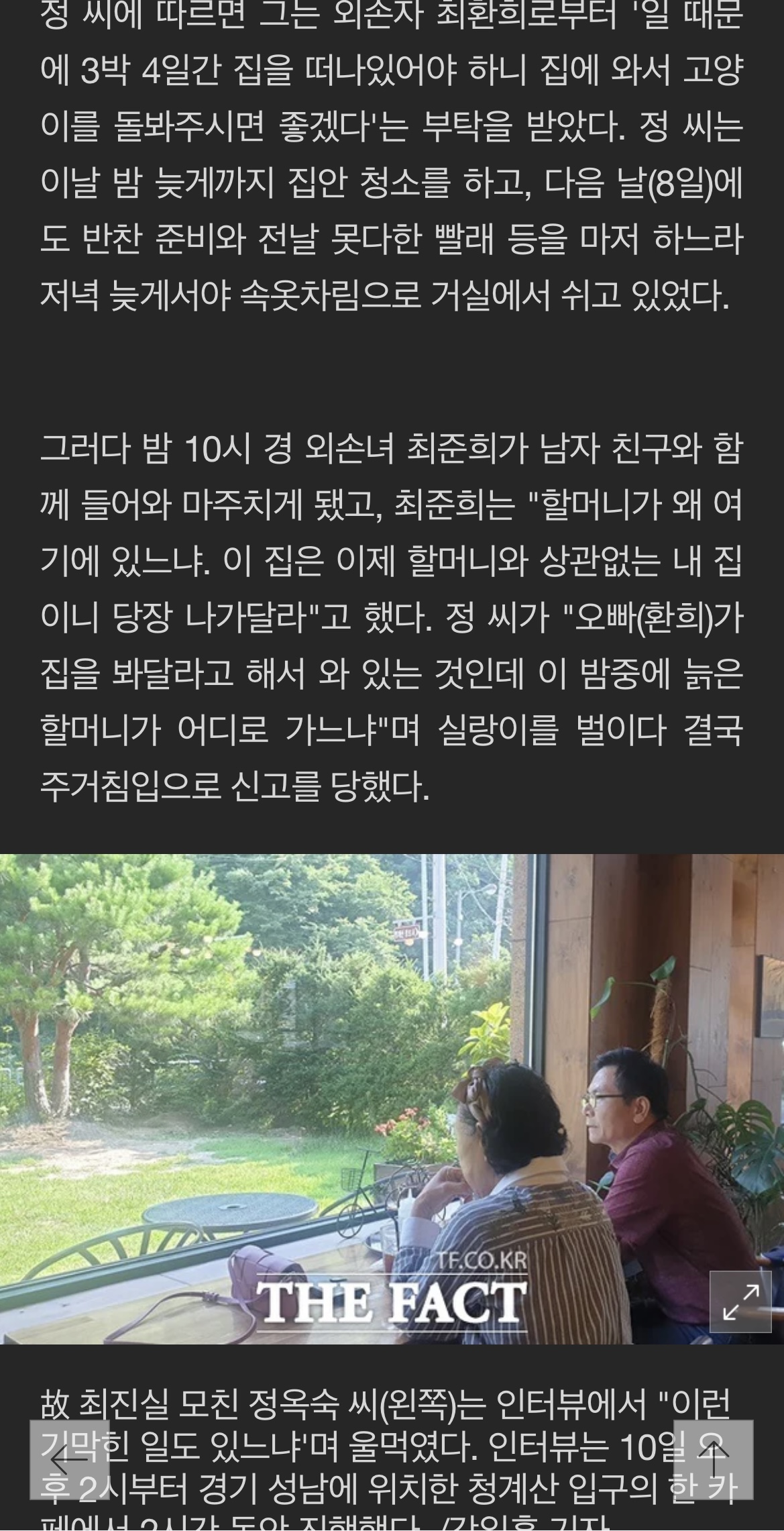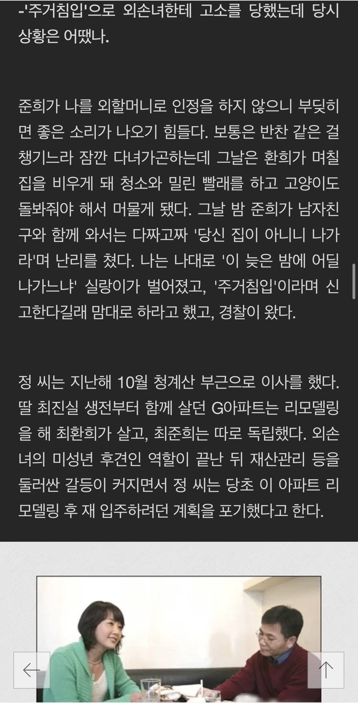 '주거침입'으로 경찰에 신고받았다. 최환희는 이른 새벽에 서초경찰서에 5시간동안 피의자 조사를 받았다. 이는 최준희가 빨래 청소를 부탁하러 온 것을 이용한 것이다. 최준희는 외할머니를 '주거침입'으로 고소한 외손녀로, SNS에서 활발히 소통하는 인플루언서의 활동도 하고 있다. 최진실의 모인 정옥숙씨는 최준희의 신고로 경찰에 신고받았다. 경찰서에는 5시간동안 '주거침입' 혐의로 피의자 조사를 받았다고 한다. 정옥숙씨는 외손녀의 연락을 받고 최환희의 아파트에 방문했다고 한다. 이 아파트는 최진실 가족이 함께 살았던 곳으로, 최준희가 현재 거주하고 있다. 최준희는 따로 오피스텔에서 생활하고 있다고 한다. 이에 따르면, 정씨는 최환희로부터 여러 가지 기막힌 일들을 당했다고 한다.
