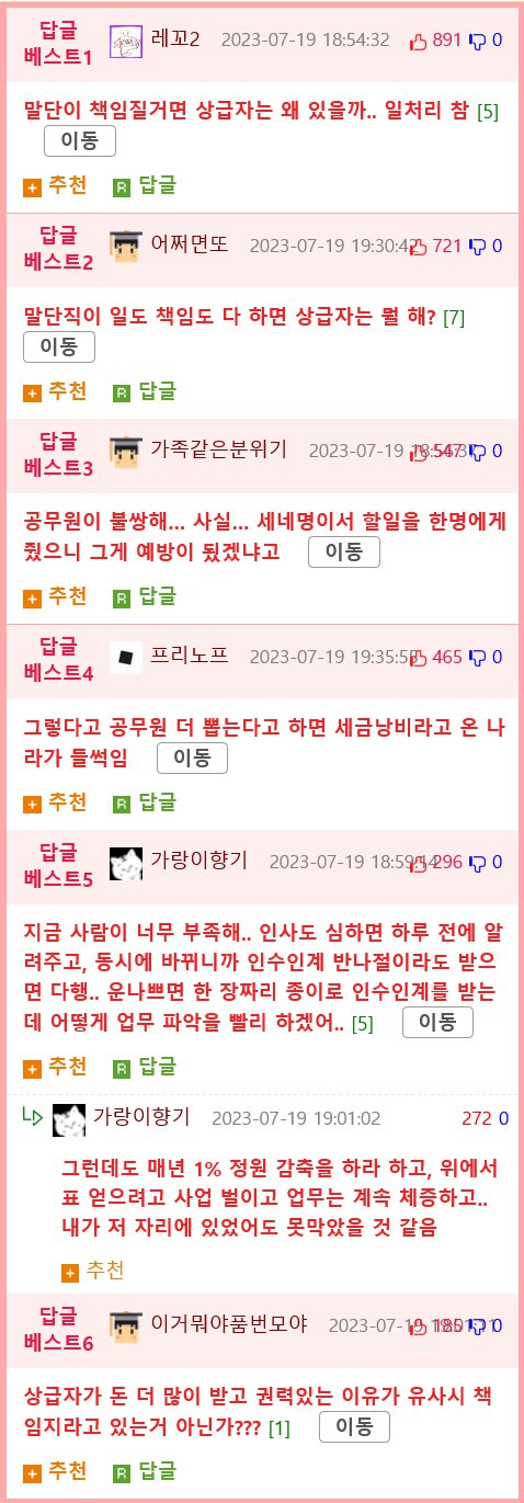 시사토크 어제, 2015 공무원 • illlil | 이번 사고 관련담당 오송 시설관리 공무원.. 이번 사고로 피해자들도 안타깝지만 엊그제 부터 계속 집못가고 재난 대비 근무 하는 공무원들도 불쌍하다. 특히 사고 업무 담당자ㅠㅠ 언론이랑 댓글들이 전부 공무원들 욕하며 책임지라 하는데 오송읍 전체에 시설관리 담당자는 1명임. 그것도 이것보다 더 업무량 많은 2~3개 다른 업무랑 같이함 ㅋㅋ 누가 그자리 있어도 못막음. 지하차도 뿐 아니라 여기저기서 침수됐다고 정신없이 전화오고 자기 집, 가게 물들어온 다고 난리치는 통에 제방터지고 몇분만에 침수되는 이런 정신없는 상황에 예측이 어렵지... 전문가들은 미리 ~했어야 했다고 하는데 그런 말 누가 못해 ㅋㅋ 결과론적으로 그 자리는 사고예방이 아니라 사고 났을때 책임지고 처벌받기 위한 자리임. 담당자는 파면되고 감옥가야겠지만 사고는 계속 일어날 것임.
