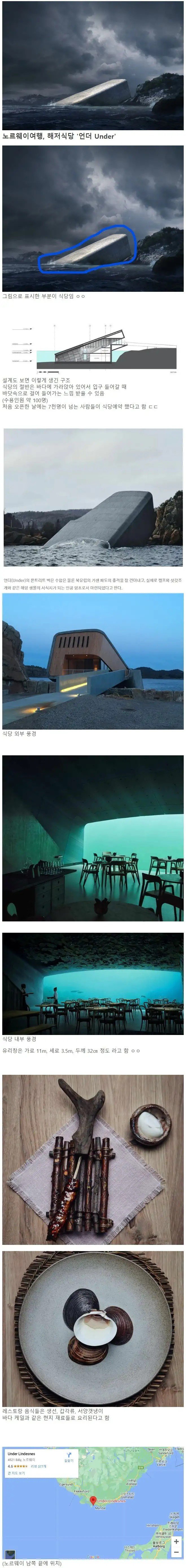 노르웨이여행을 계획하고 있다면 해저식당 '언더 Under'을 꼭 방문해보세요. 이 식당은 바다에 가라앉아 있는 구조로, 입구로 들어갈 때 바닷속으로 걸어들어가는 느낌을 받을 수 있습니다. 식당은 약 100명을 수용할 수 있으며, 오픈 첫날에는 7천명이 넘는 사람들이 예약을 했다고 합니다. 언더의 콘크리트 벽은 수압과 거센 파도의 충격을 견뎌낼 수 있으며, 해양 생물의 서식지로 마련된 인공 암초입니다. 식당 내부와 외부 풍경은 아름답고 특별한 경험을 선사할 것입니다. 노르웨이 남쪽 끝에 위치한 이 식당은 꼭 한번 방문해보길 추천합니다.