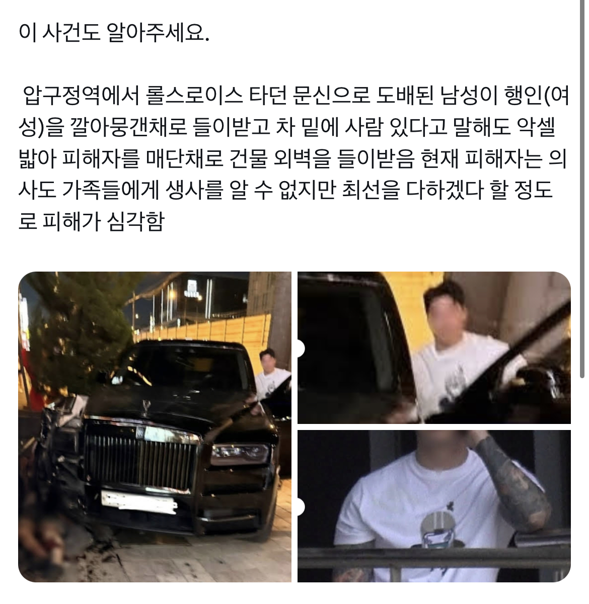 압구정역에서 발생한 사건을 소개해드리겠습니다. 이 사건은 롤스로이스에 문신이 도배된 남성이 행인을 치고 들이받은 후 차 밑에 있는 사람의 존재를 무시하였습니다. 심지어 피해자가 차 밑에 있다는 사실을 알리고도 악셀을 밟아 피해자를 매달린 채 건물 외벽을 들이받았습니다. 현재 피해자의 생사는 알 수 없지만, 가족들은 최선을 다해 피해자의 상태를 확인하려고 노력하고 있습니다. 이 사건은 피해의 심각성을 감안할 때 매우 충격적입니다.