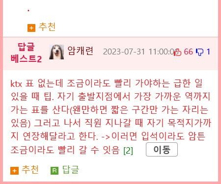 나만 모르는 ktx 꿀팁 동태탕 쪽지보내기자기소개아이디로 검색전체게시물 08-06 6,256 회 0 건 KTX에 대한 꿀팁에 관한 글이다. 전체 내용은 좀 혼란스러우나, ktx의 일반실 좌석 간격이 930mm라는 것과 5호차를 선택하면 상대적으로 좌석 간격이 넓고 쾌적하다는 것을 알려주는 내용이 있다. 또한, 급한 일이 있을 때 근처 역까지 끼고 가는 방법이 있는 것 같다. 목록 이메일 주소는 공개되지 않습니다. 댓글 * 이름 * 비밀번호 * 비밀글 사용 제목 글쓴이 조회 날짜 부산 엑스포 유치 사실상 끝 지니까꿍 쪽지보내기자기소개아이디로 검색전체게시물 5,860 0 23-08-08 지니까꿍 쪽지보내기자기소개아이디로 검색전체게시물 5,860 23-08-08 쥬얼리 이지현 근황 도레미 쪽지보내기자기소개아이디로 검색전체게시물 5,919 0 23-08-07 도레미 쪽지보내기자기소개아이디로 검색전체게시물 5,919 23-08-07 주우재 : 들어 이 병X같은 XX야.mp4 아시가루 쪽지보내기자기소개아이디로 검색전체게시물 6,878 0 23-08-07 아시가루 쪽지보내기자기소개아이디로 검색전체게시물 6,878 23-08-07 영국 잼버리 철수 이유, 단순히 폭염문제 아님 밝은횃불 쪽지보내기자기소개아이디로 검색전체게시물 5,334 0 23-08-07 밝은횃불 쪽지보내기자기소개아이디로 검색전체게시물 5,334 23-08-07 롤스로이스남 신상 공개한 카라큘라 근황 얼음사이다 쪽지보내기자기소개아이디로 검색전체게시물 5,744 0 23-08-06 얼음사이다 쪽지보내기자기소개아이디로 검색전체게시물 5,744 23-08-06 롤스로이스 참사 사건 새로운 소식 아시가루 쪽지보내기자기소개아이디로 검색전체게시물 5,531 0 23-08-06 아시가루 쪽지보내기자기소개아이디로 검색전체게시물 5,531 23-08-06 ⭐ 나만 모르는 ktx 꿀팁 동태탕 쪽지보내기자기소개아이디로 검색전체게시물 6,257 0 23-08-06 동태탕 쪽지보내기자기소개아이디로 검색전체게시물 6,257 23-08-06 조선인에 대해 잘 알고 있던 명나라 재상 얼음사이다 쪽지보내기자기소개아이디로 검색전체게시물 6,024 0 23-08-05 얼음사이다 쪽지보내기자기소개아이디로 검색전체게시물 6,024 23-08-05 세계스카우트 연맹도 조기 폐회 권고 그러나 한국 강행 1 아시가루 쪽지보내기자기소개아이디로 검색전체게시물 5,142 1 23-08-05 아시가루 쪽지보내기자기소개아이디로 검색전체게시물 5,142 23-08-05 압구정에서 사건터짐 지니까꿍 쪽지보내기자기소개아이디로 검색전체게시물 6,265 0 23-08-04 지니까꿍 쪽지보내기자기소개아이디로 검색전체게시물 6,265 23-08-04 서현역 칼부림...1명 사망 1명 의식저하 상태...병원 이송 세계는지금 쪽지보내기자기소개아이디로 검색전체게시물 5,700 0 23-08-04 세계는지금 쪽지보내기자기소개아이디로 검색전체게시물 5,700 23-08-04 잼버린 참가자 SNS 근황 재미난도시락 쪽지보내기자기소개아이디로 검색전체게시물 5,814 0 23-08-04 재미난도시락 쪽지보내기자기소개아이디로 검색전체게시물 5,814 23-08-04 개그맨들은 허접한 몰카라도 속아줄까??? 몽비쥬 쪽지보내기자기소개아이디로 검색전체게시물 5,790 0 23-08-03 몽비쥬 쪽지보내기자기소개아이디로 검색전체게시물 5,790 23-08-03 세계 잼버리 근황 몽비쥬 쪽지보내기자기소개아이디로 검색전체게시물 5,520 0 23-08-03 몽비쥬 쪽지보내기자기소개아이디로 검색전체게시물 5,520 23-08-03 과거 일본에 존재했다는 직업 옆집총각 쪽지보내기자기소개아이디로 검색전체게시물 7,855 0 23-08-03 옆집총각 쪽지보내기자기소개아이디로 검색전체게시물 7,855 23-08-03 요즘 조금 위험한 SNL 동태탕 쪽지보내기자기소개아이디로 검색전체게시물 6,577 0 23-08-02 동태탕 쪽지보내기자기소개아이디로 검색전체게시물 6,577 23-08-02 선을 넘었던 90년대 공중파 방송 달콤별 쪽지보내기자기소개아이디로 검색전체게시물 6,363 0 23-08-02 달콤별 쪽지보내기자기소개아이디로 검색전체게시물 6,363 23-08-02 주호민 이 고소한 특수교사 복직 확정!!! 달콤별 쪽지보내기자기소개아이디로 검색전체게시물 5,423 0 23-08-02 달콤별 쪽지보내기자기소개아이디로 검색전체게시물 5,423 23-08-02 2023년 가장 많이 방문한 20개 도시.jpg 세계는지금 쪽지보내기자기소개아이디로 검색전체게시물 5,483 0 23-08-01 세계는지금 쪽지보내기자기소개아이디로 검색전체게시물 5,483 23-08-01 중고차 딜러 레전드.jpg 재미난도시락 쪽지보내기자기소개아이디로 검색전체게시물 5,736 0 23-08-01 재미난도시락 쪽지보내기자기소개아이디로 검색전체게시물 5,736 23-08-01 교촌치킨 배달비 0원 얼음사이다 쪽지보내기자기소개아이디로 검색전체게시물 5,425 0 23-08-01 얼음사이다 쪽지보내기자기소개아이디로 검색전체게시물 5,425 23-08-01 노르웨이의 해저 레스토랑 .jpg 금단비 쪽지보내기자기소개아이디로 검색전체게시물 5,461 0 23-07-31 금단비 쪽지보내기자기소개아이디로 검색전체게시물 5,461 23-07-31 옆 나라 연예인 결혼 레전드ㄷㄷ.jpg 밝은횃불 쪽지보내기자기소개아이디로 검색전체게시물 5,786 0 23-07-31 밝은횃불 쪽지보내기자기소개아이디로 검색전체게시물 5,786 23-07-31 카페에 간 어린이 햄스터들 만화.manhwa 얼음사이다 쪽지보내기자기소개아이디로 검색전체게시물 5,422 0 23-07-31 얼음사이다 쪽지보내기자기소개