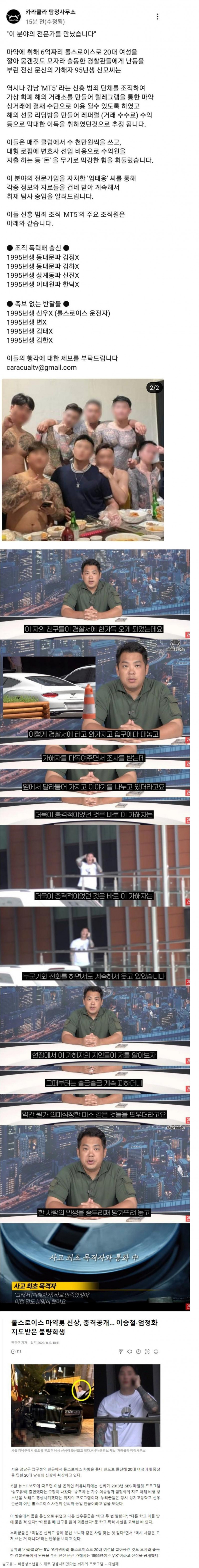 카라큘라 탐정사무소는 최근 한 분야의 전문가를 만났다고 밝혔습니다. 이 전문가는 마약에 취해 여성을 공격하고 경찰에게 난동을 부린 가해자로 알려져 있습니다. 이 가해자는 강남 'MT5'라는 범죄 조직을 조직하여 텔레그램을 통한 마약 상거래에 결재 수단으로 활용하는 등 범죄 소득을 취하고, 평소에는 매주 클럽에서 수 천만원을 쓰고 대형 로펌에 막대한 돈을 지출하는 등 재력을 이용하여 힘을 휘둘렀습니다. 이들의 주요 조직원들의 정보도 공개되었는데, 그 중에는 출신, 지역 및 이름 등이 포함되어 있습니다. 이들의 행각에 대한 제보는 이메일을 통해 받을 예정입니다. 이 가해자는 경찰 조사 중에도 지인들과 어떤 대화를 나누는 등 이상한 행동을 보였으며, 그의 지인들은 그를 알아보고 그의 행동에 대해 이야기도 나누었습니다. 이러한 사건으로부터 이 가해자는 마약 및 비행 등의 범죄로 인한 형사 처벌을 받을 것으로 예상됩니다.