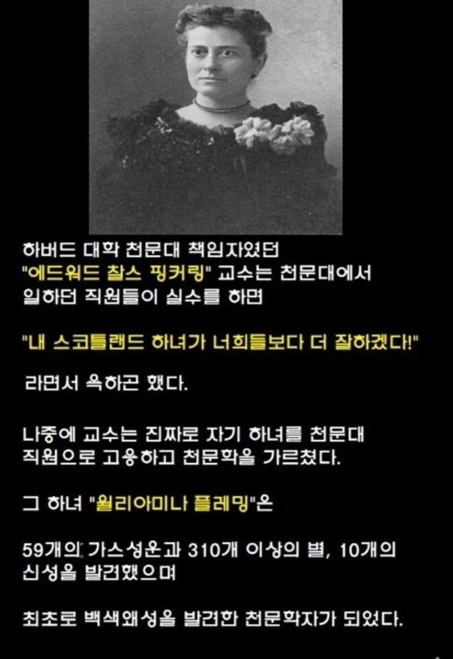 하버드 대학 천문대의 책임자였던 에드워드 찰스 핑커링 교수는 실수를 저지르는 직원들에게 자주 욕을 했다고 알려져 있다. 그의 욕설은 종종 "내 스코틀랜드 하녀가 너희들보다 더 잘하겠다!"였다. 이 욕설은 나중에 진지하게 이루어지게 되었다. 핑커링 교수는 자신의 하녀인 월리아미나 플레밍을 천문대 직원으로 고용했고, 그녀에게 천문학을 가르치기 시작했다.