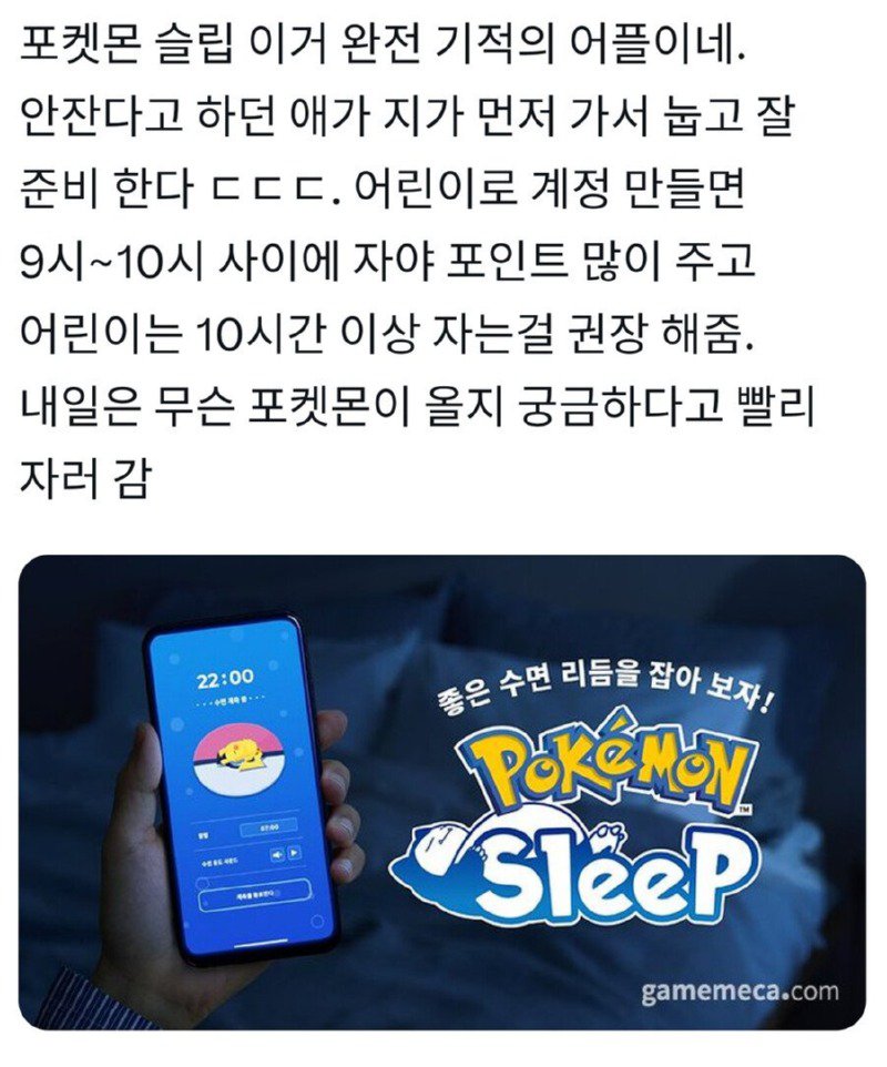 포켓몬 슬립은 어린이나 어린 마음을 가진 사람들에게 추천하는 어플입니다. 이 어플은 기적같은 기능을 가지고 있습니다. 예를 들어, 잠을 잘 자지 않는 아이가 슬립 어플을 사용하여 누워 자기를 먼저 가지고 자는 장면을 보여줄 수 있습니다. 또한 어린이로 계정을 만들면 많은 포인트를 얻을 수 있고, 꾸준히 10시간 이상 자는 것을 권장하며 높은 포인트를 받을 수 있도록 도와줍니다. "내일은 무슨 포켓몬이 올지 궁금하다"고 생각하며 빨리 잠자리에 들기를 선호하는 사람들에게도 유용한 어플입니다. 또한 포켓몬 슬립 어플에는 포켓몬 양치게임도 있습니다. 이 게임은 양치하는 동안 AR로 포켓몬 모자를 씌워주고 골고루 닦을 수 있도록 안내합니다. 게임을 완료하면 몬스터볼을 던져서 포켓몬을 잡을 수 있고, 동시에 찍힌 사진도 꾸밀 수 있습니다. 이 어플을 설치한 사람 중 한 사용자는 아이에게 양치를 잔소리하지 않아도 되었고 계속해서 업데이트를 요청하고 있습니다. 현재로서 254마리의 포켓몬을 모았지만 아직 30마리밖에 남지 않아서 아쉬워합니다.