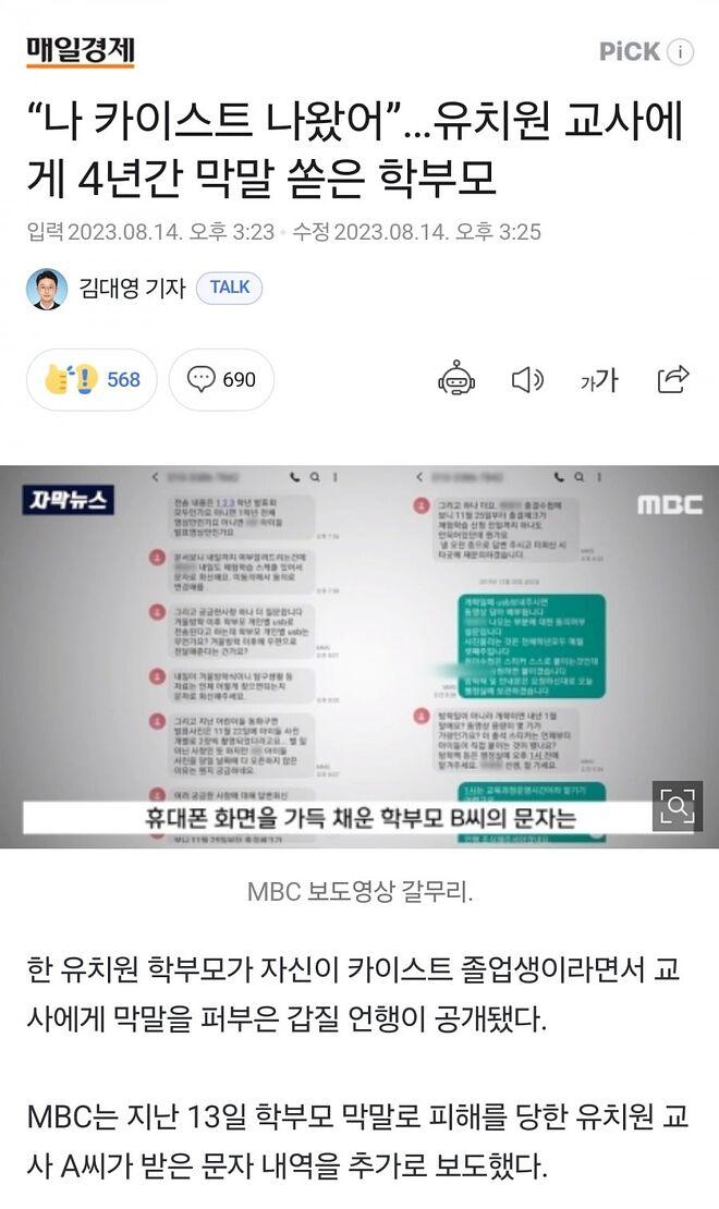 스트 나왔어." 그리고 "유치원 교사에게 4년간 막말 쏟은 학부모"라는 제목의 기사가 매일경제에 게재되었다. 기사에 따르면 한 유치원 교사인 A씨가 4년간 막말을 쏟아내던 학부모 B씨로부터 피해를 받았다는 내용이다.