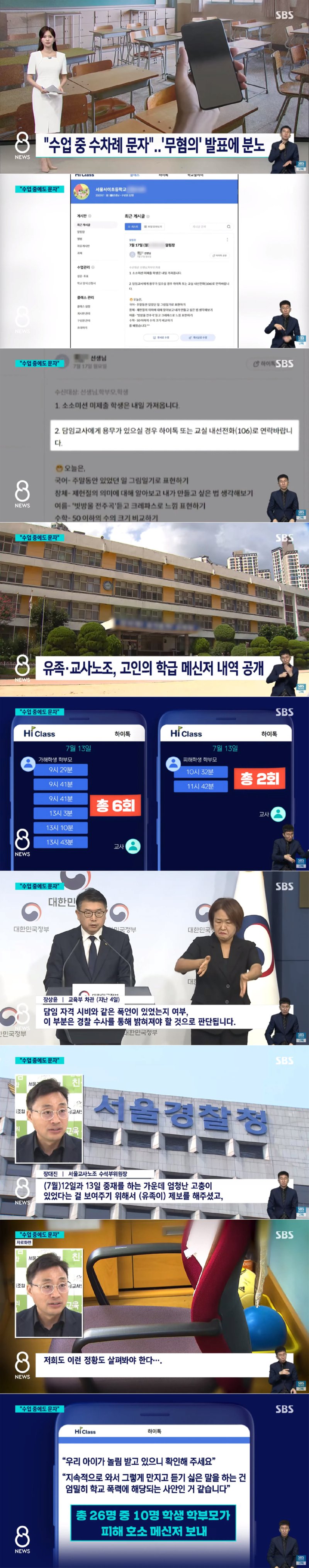최근 수업 중에 학생들이 수차례 문자를 보내는 사건으로 인해 교육 당국과 학부모들은 분노하고 있다. 이러한 사건이 발생한 이유는 수업 중에도 학생들이 휴대폰을 사용해서 문자를 보내기 때문이다. 이 사건은 대한민국 정부와 한민국 정부에게도 분노를 불러일으키고 있다. 조합이 "수업 중에도 문자"라는 주장을 제기하고 있으며, 서울에서도 이와 관련한 자료화면이 공개되었다. 이 사건은 학부모와 학생들에게 큰 충격을 주었고, 고인의 학급 메신저 내역도 공개되었다. 유족과 교사노조는 이 사건에 대한 조사를 요구하고 있는 상황이다. 이러한 사건은 학교 내부에서 발생한 것으로 알려졌으며, 최근 게시판에도 이와 관련한 알림장이 게시되었다. 수업관리와 관련하여 선생님과 학부모, 학생들 사이에 의견 차이가 있으며, 학교양식신청서와 관리에 대한 투표가 진행되고 있다. 이외에도 다양한 과제와 수업 내용이 존재하며, 학생들은 소소미션 미제출을 하면 다음날 가져와야 하며, 선생님은 담당 업무가 있을 경우 하이톡이나 내선전화를 통해 연락하라고 안내하였다. 일부 구성원들은 주말동안 있었던 일에 대한 그림일기를 작성해야 하며, 창체 활동을 통해 제헌절의 의미와 법을 생각해보는 시간을 가져야 한다. 또한, 노래 '빗방울 전주곡'을 듣고 크레파스로 느낌을 표현하고, 수학 수업에서는 50 이하의 수의 크기를 비교하는 내용이다. 교사들은 서울교사노조 수석부위원장 장대진과 서울서이초등학교의 교사 장상윤이 주요 인물로 이 사건에 대한 조사를 진행하고 있다.