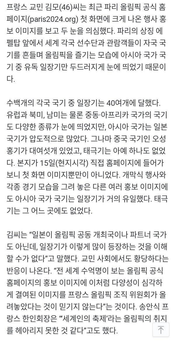 파리 올림픽 공식 홈 페이지에서 홍보 이미지에는 세계 각국의 선수들이 자국 국기를 흔들며 올림픽을 즐기는 모습이 보였다. 그러나 이 중 아시아 국가 중에는 유독 한 일장기만이 눈에 띄었고, 태극기는 하나도 없었다. 일부 교민들과 김씨는 이러한 이미지에 대해 일본 편애가 드러났다는 지적을 하고 있다. 그들은 이렇게 다양성이 결여된 이미지가 파리 올림픽의 취지에 어긋난다고 비판하고 있다.