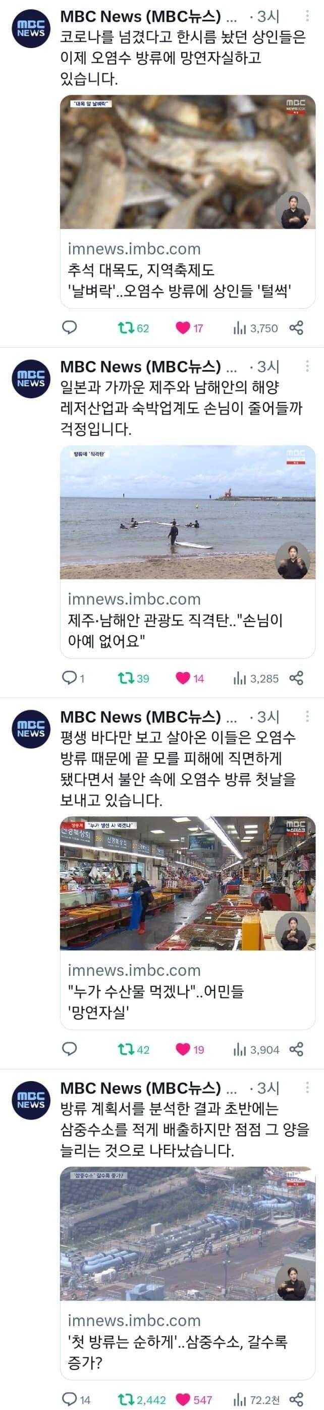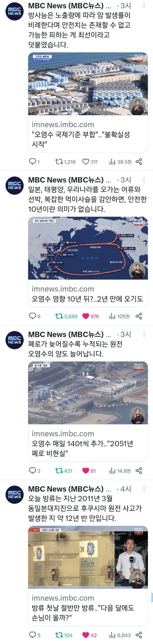 MBC뉴스는 방사능이 발생하면 암 발생률이 늘어난다고 보도하고, 안전성이 없으며 최선은 피하는 것이라고 말했습니다. 오염수도 문제가 되고 있으며, 이에 대한 국제기준이 불확실하다는 의견도 제기되고 있습니다. 또한 어류와 선박이 오염에 노출되고 있는데, 이는 우리나라의 안전성과 먹이사슬을 감안하면 큰 의미가 없다는 것을 강조했습니다. 방류 중인 오염수의 양은 계속해서 늘어나고 있으며, 폐로가 늦어질수록 그 양도 더 늘어난다는 점도 지적되었습니다. 방류시점이 다가오면 상인들은 망연자실하고 있으며, 지역축제와 추석 행사도 영향을 받고 있습니다.