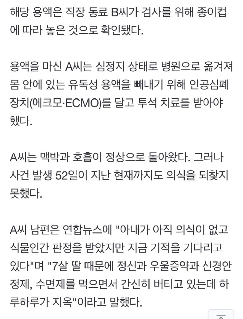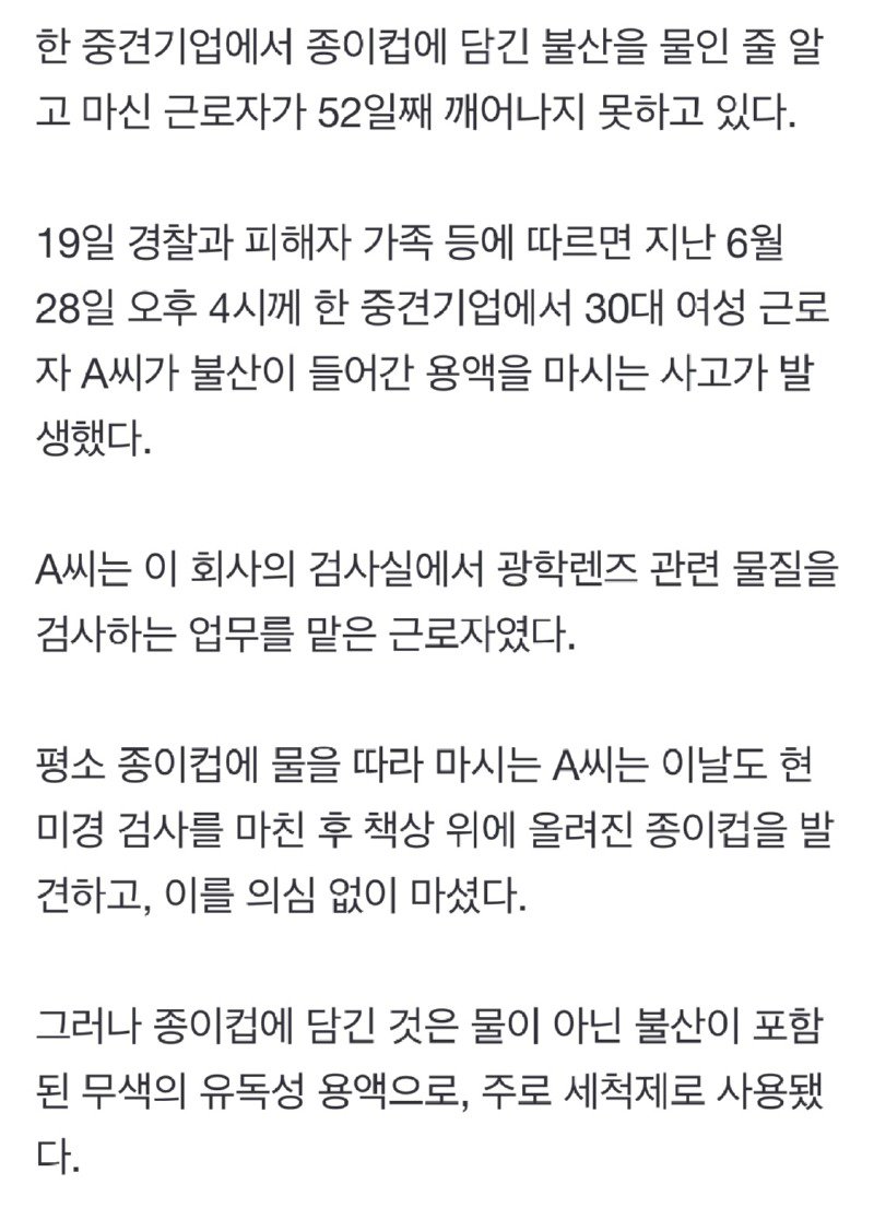 은 피해자의 자백, 법적 책임, 유독 물질 관리 등이다. 피해자인 A씨는 불산이 포함된 용액을 물인 줄 모르고 마신 후 현재까지 의식을 되찾지 못하고 있다. 경찰은 고의성 여부를 조사 중이며, 유독 물질 관리에 대한 법규 검토를 진행하고 있다. 중견기업인 회사 측은 업무상과실치상과 화학물질관리법 위반 등의 혐의로 수사를 받고 있다. 피해자 가족은 아직 의식 없는 상태를 버텨가며 기적을 기다리고 있다.