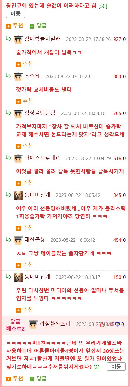 글 전체에 대한 요약: 어떤 가게에서는 술값이 비싸다는 이야기가 나왔는데, 이에 대한 답글들이 달리고 있다. 가게의 답글에 따르면 숟가락 교체 및 추가에 500원 비용이 든다고 하며, 맛있는 음식이나 음료를 제공한다고 소개하고 있다. 일부 사용자들은 가격에 대해 납득할 수 없다는 의견을 내놓고 있으며, 매장 이용료와 추가 비용, 사용한 집기류의 비용 때문에 가격이 높게 책정된 것으로 추측한다. 다른 사용자들은 미디어의 선동에 대해 경계심을 표하고 있는데, 한 사용자는 가게의 정책을 이해하고 있다고 말하며, 다른 사용자는 가게를 비난하고 있다.