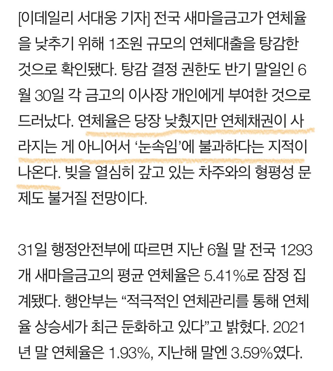 기사에 따르면, 전국 새마을금고는 연체율을 낮추기 위해 1조원 규모의 연체대출을 탕감한 것으로 확인되었습니다. 이탈 결정 권한은 6월 30일 각 금고의 이사장에게 개인적으로 부여되었으며, 이로 인해 연체율은 하루만에 6.2%에서 5.4%로 감소하였습니다. 그러나 이는 연체채권을 사라지게 한 것이 아니라, 단순히 '눈속임'에 불과하다는 지적이 있습니다. 새마을금고는 형평성 문제와 관련해 채무자와의 논란이 예상되며, 실제로 빚을 열심히 갚고 있는 차주들의 의견도 논란의 소지가 있습니다. 최근에는 적극적인 연체관리로 인해 연체율 상승세가 둔화되고 있으며, 2021년 말에는 1.93%, 작년 말에는 3.59%였던 연체율이 지금은 5.41%인 것으로 추정됩니다.