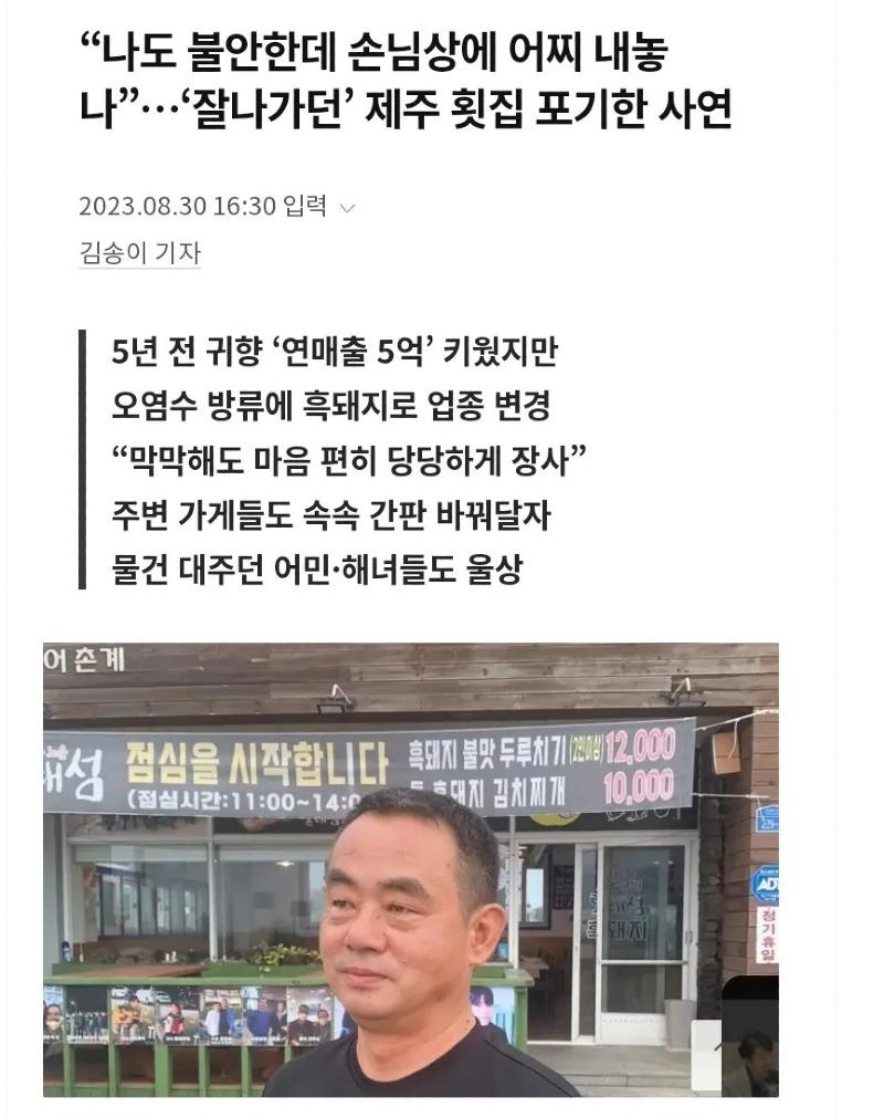 2023년 8월 30일 오후 4시 30분, 제주의 한 횟집 주인이 자신의 어려운 사연을 밝혔다. 그는 다섯 년 전 고향으로 돌아와서 '연 매출 5억' 원을 올릴 정도로 번창했지만, 오염수 방류 사고가 발생하여 업종을 흑돼지로 변경해야 했다. 여전히 불안한 마음을 안고 있는 그는 손님들에게 어떻게 이 사실을 전해야 할지 고민하면서 "나도 불안한데 손님상에 어찌 내놓 나"라며 괴로워했다.