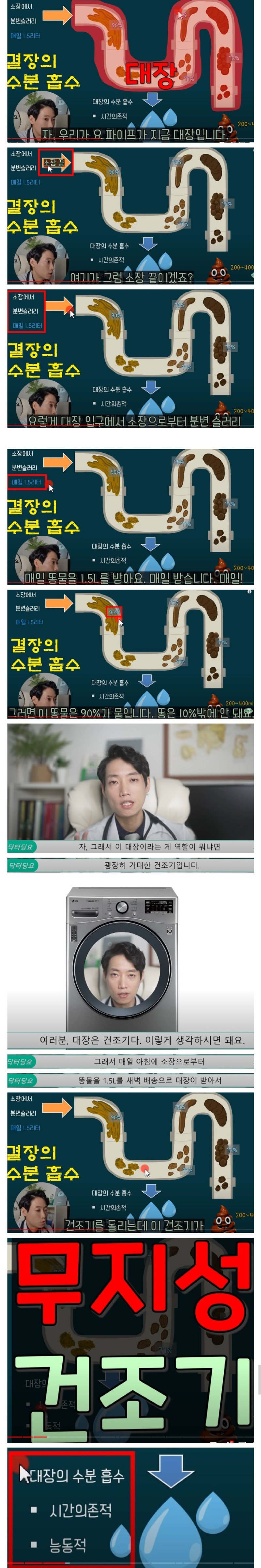 소장에서 매일 1.5리터의 물을 흡수하는데, 이는 결장에서도 동일하게 수분 흡수가 이루어진다. 대장은 건조기로 볼 수 있으며, 이 건조기는 시간에 따라 물을 흡수하고 분변 슬러리를 만든다. 대장은 90% 이상의 수분을 흡수하며, 변을 참을수록 물의 비율이 높아진다. 그러나 너무 오래 참으면 수분이 빼앗기기 때문에 적절한 변에 주의해야 한다. 변을 참으면 대장이 건조기로 작용하여 빼앗은 수분을 다시 흡수한다. 대장은 무조건 수분 흡수만 하기 때문에 변의 상태는 그다지 중요하지 않다. 수분은 대장으로 전달되기까지 일정한 시간이 걸리기 때문에 수분의 손실이 발생할 수 있다. 또한 대장은 특정한 문제가 없는 이상 변의 상태를 신경쓰지 않는다. 따라서 변비 환자들은 필요에 따라 언제든지 변을 싸야 한다. 변비와 수분 측면에서 중요한 것은 적절한 변을 가지고 신속하게 대변하는 것이다. 변을 참지 않고 적절한 시기에 변을 싸는 것이 좋다.