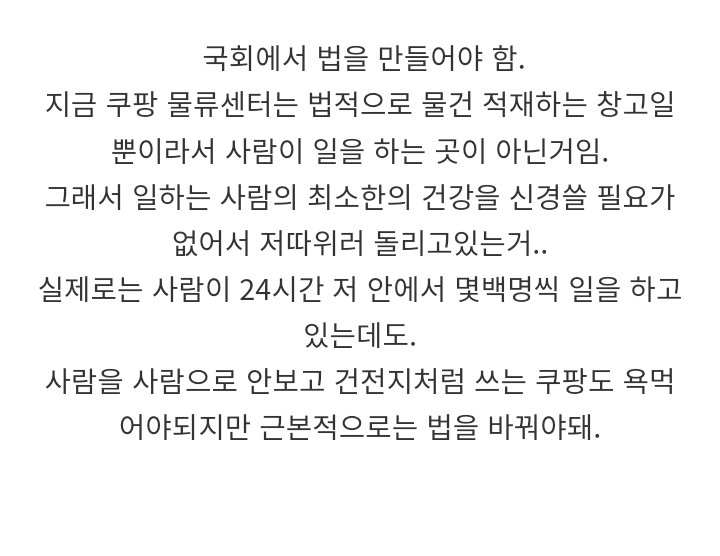 이에 대해 쿠팡은 물류센터에는 에어컨이 있다고 주장하였으나, 실제로는 공정에만 에어컨이 설치되어 있었습니다. 특히 환기가 되지 않는 부분은 습도에 영향을 미쳐 찜통이나 찜질방과 같은 느낌이 든다고 합니다. 하지만 현재로서는 물류센터에 냉난방과 환기시설을 강제로 설치할 수 없는 상황입니다.