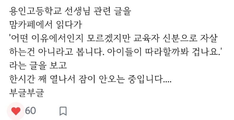 이 글을 읽으며 심정이 허전하고 매우 안타까운 마음이 들었을 것 같습니다. 교육자로서의 책임과 부담감은 매우 크고, 학생들의 영향력도 민감하지만 그럼에도 불구하고 이렇게 비극적인 결말을 맞이하는 선생님들이 계시다는 것은 정말 슬픈 일입니다.