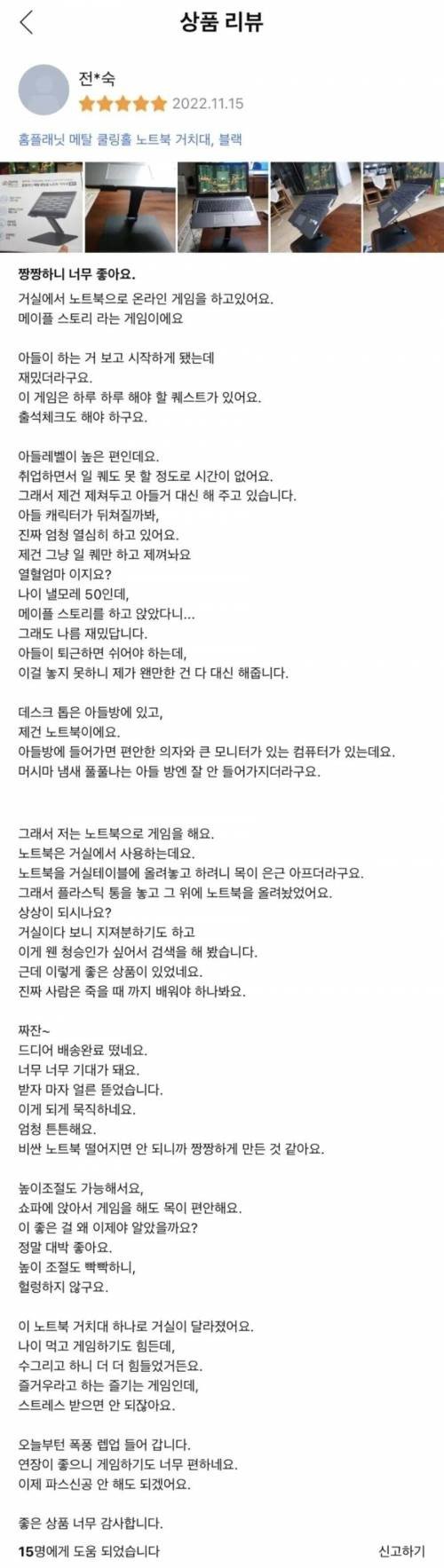 2022년 11월 15일에 구입한 홈플래닛 메탈 쿨링홀 노트북 거치대가 너무 좋다. 거실에서 노트북으로 메이플 스토리라는 게임을 하고 있는데, 하루에도 할 일들이 많아서 시간이 부족하다. 그래서 아들 것을 도와주고 있다. 아들은 레벨이 높고 새로운 퀘스트를 해야 하는데, 취업을 해서 시간이 없어서 제것은 놔두고 아들 것을 도와주고 있다. 아들이 뒤쳐지지 않도록 열심히 하고 있다. 나이가 낼모레 50인데도 메이플 스토리를 하고 있는데, 재미있다. 아들이 퇴근하면 쉬어야 하는데, 게임을 놓지 못하니까 나서서 대신 해주고 있다. 아들방에는 데스크 톱이 있고 내 노트북은 거실에서 사용한다. 하지만 거실테이블에 올려놓으면 목이 아프고 불편해서 플라스틱 통 위에 노트북을 올려놓았다. 그래도 이게 청승인가 싶어서 검색을 해봤는데 이렇게 좋은 상품이 있었다. 배송을 기다리며 너무 기대가 된다. 받자마자 뜯어봤는데 묵직하고 튼튼하다. 비싼 노트북이 떨어지면 안 되니까 엄청 튼튼한 것 같다. 높이도 조절할 수 있어서 쇼파에서 게임을 해도 목이 편하다. 왜 이제야 알았을까 정말 대박 좋다. 거실이 이 노트북 거치대로 달라졌다. 나이가 들어서 게임하는 것도 힘든데, 아들 것까지 도와주니 더 힘들어진다.