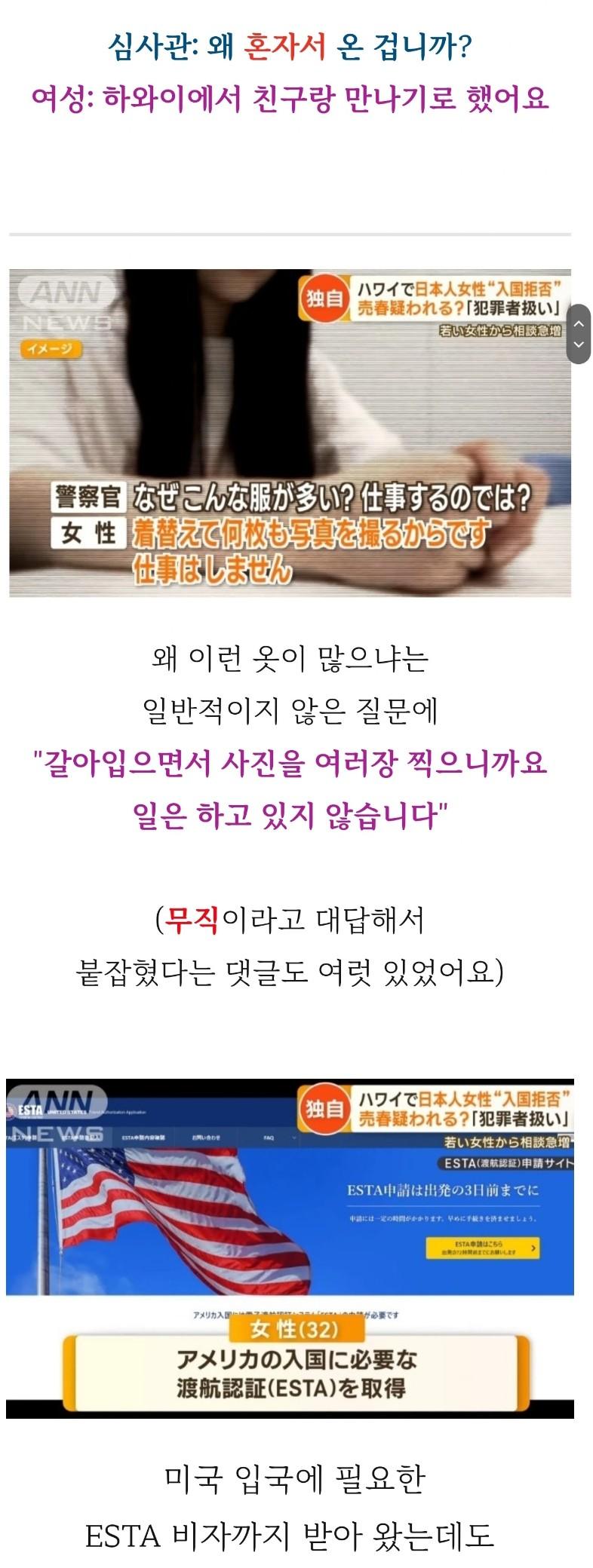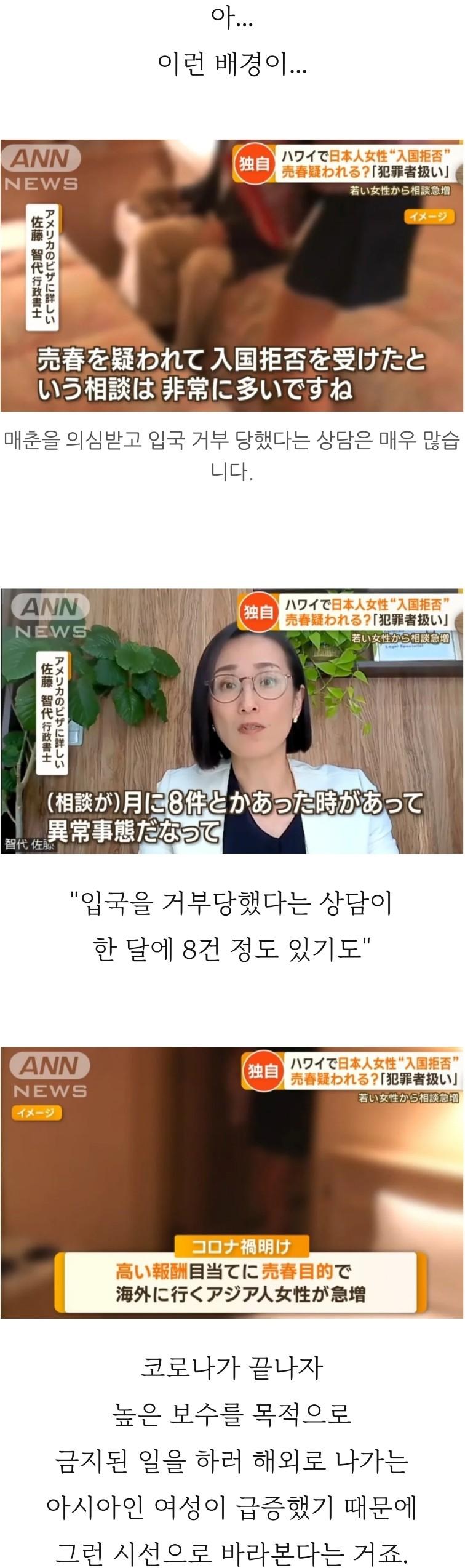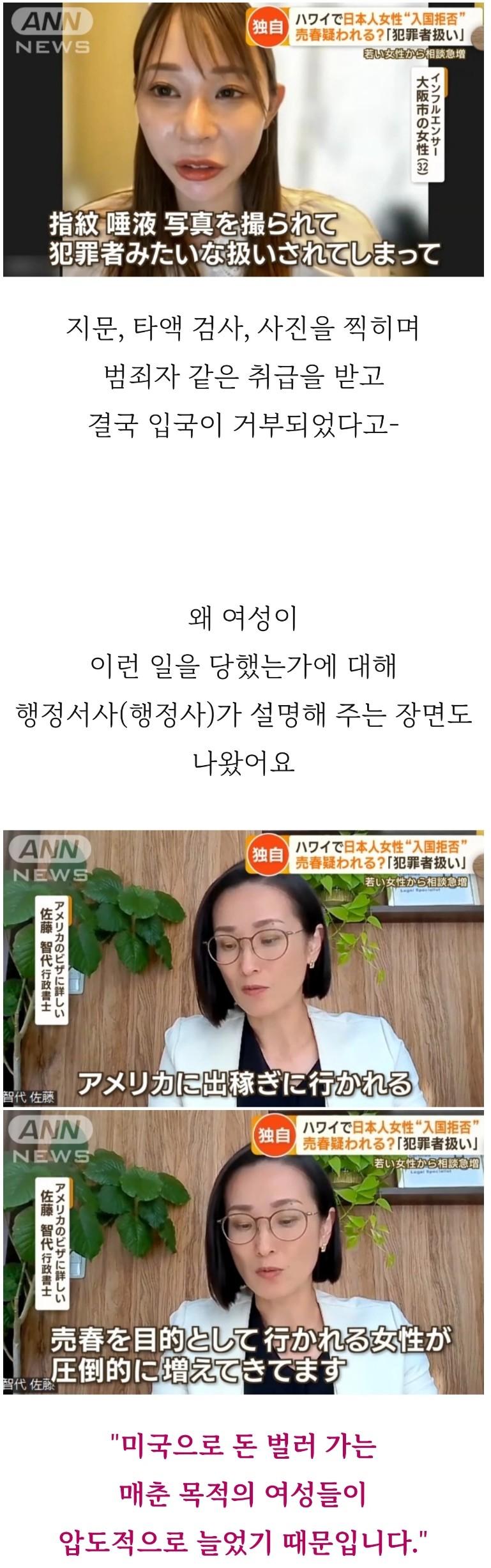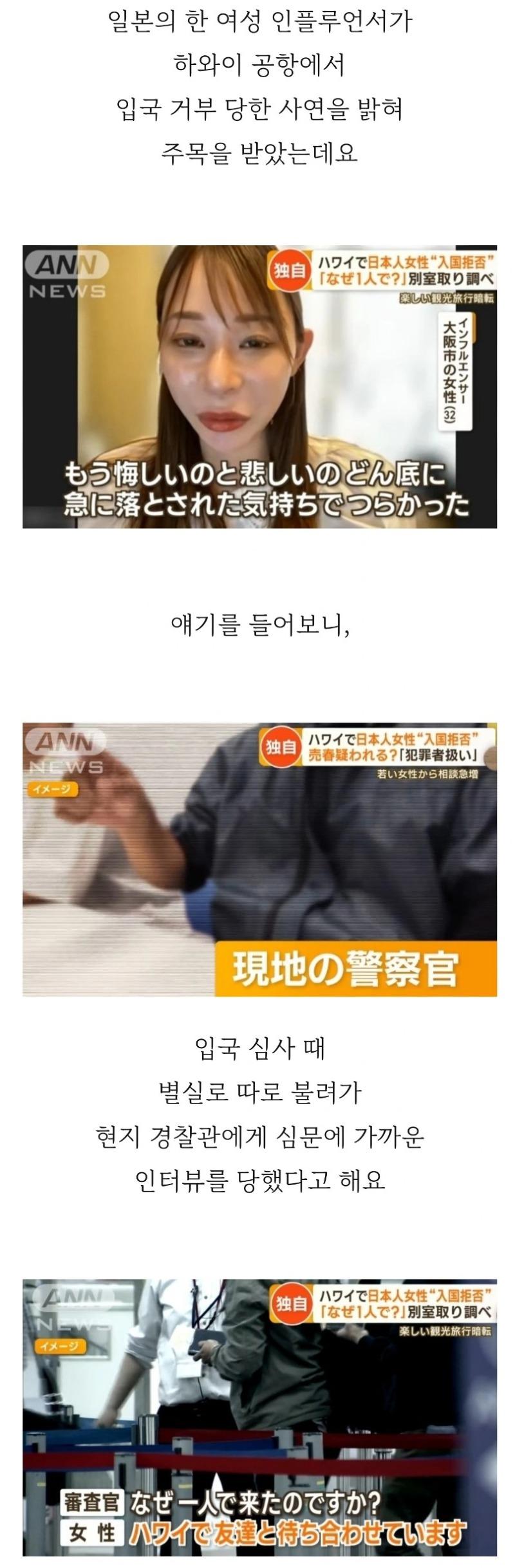 ANN NEWS는 이번에 발생한 일본 여성 인플루언서의 하와이 입국 거부 사건을 보도했습니다. 이 여성은 하와이에서 친구를 만나기로 했으나 현지에서 입국 심사를 받는 과정에서 현지 경찰관에게 인터뷰를 당했습니다. 심사 과정에서 지문, 타액 검사, 사진 촬영을 받는 등 범죄자와 같은 취급을 받았고 결국 입국이 거부되었다고 합니다. 이 사건으로 인해 많은 이들이 입국 심사 과정의 불필요한 방법에 대해 논의하고 있습니다. 다른 이들은 이 여성이 전문적인 목적으로 하와이에 입국하려 했던 것이 아니라 사진 모델로서 활동하기 위해 입국한 것으로 알려져 있습니다.