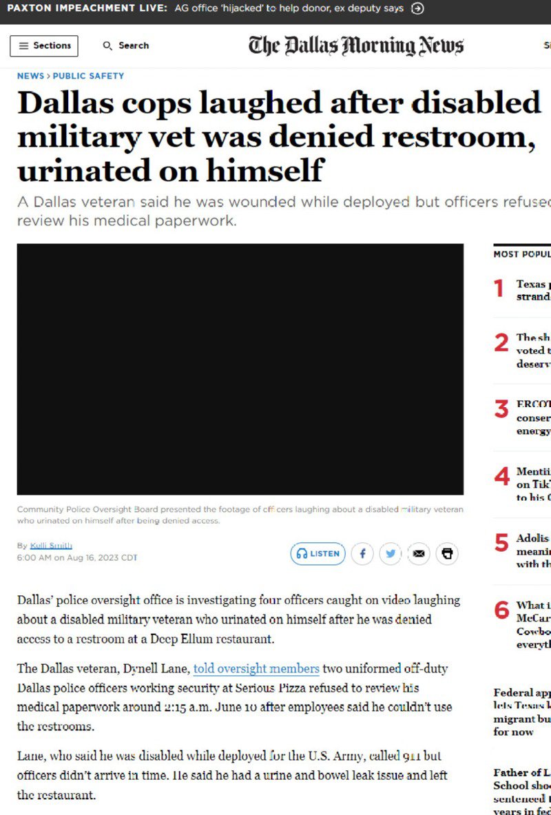 텍사스의 경찰이 장애를 가진 군인에게 화장실 이용을 거부하고 웃음을 지었다는 비디오가 공개되었다. 이 사건은 다라스의 한 식당인 Serious Pizza에서 발생했다. 이 식당에서 출근한 두 명의 경찰관이 환자 경력서를 확인하지 않고 환자인 다이넬 레인에게 화장실 이용을 거부하였다. 레인은 미군에서 사망당했지만 그의 사건은 제때 도착하지 않은 경찰에 의해 처리되지 못했다고 말했다. 그는 식당을 나와서 자신이 소변과 대변 색출 문제를 가진 환자이기 때문에 심각한 문제가 발생했다고 말했다. 다라스의 경찰감독부는 이 사건에 대해 조사 중이다.