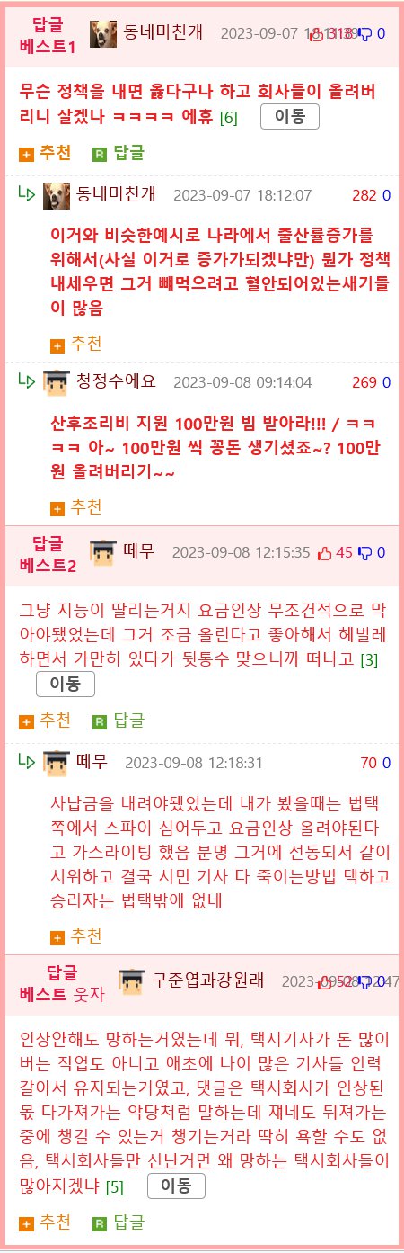 서울 법인택시 기사들은 2023년 2월부터 택시 요금이 오르면서 어려움을 겪고 있다. 기사들은 법인택시 TAXI와 택시대란을 해소하기 위해 노력하고 있지만, 요금의 상승으로 인해 받는 '기준금'도 인상되고 있다. 220위의 한 기사는 하루 12시간 일해야 기본급을 받을 수 있으며, 중노동하고 있다고 말했다. 또 다른 기사는 코로나19로 인해 회식을 자주 하지 않고 일찍 집에 돌아가는 경우가 많아졌으며, 폐업 위기에 처한 업체의 대표가 어떤 정책을 내놓을지 궁금하다고 말했다. 그 외에도 보험료, LPG 가격, 최저임금 등의 문제로 어려움을 겪고 있다는 의견도 나왔다. 하지만, 일부 댓글에서는 택시 요금 인상은 기사들의 처우 개선을 위한 것이라고 주장하는 의견도 보였다.