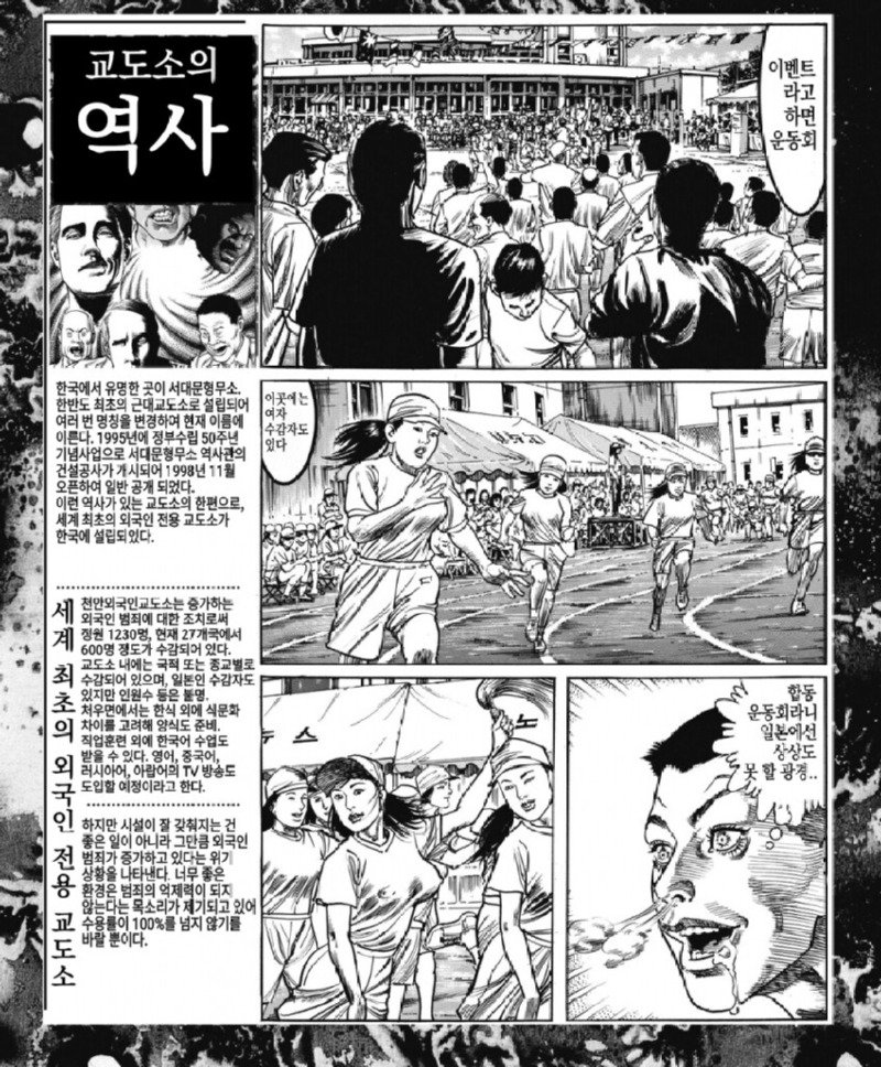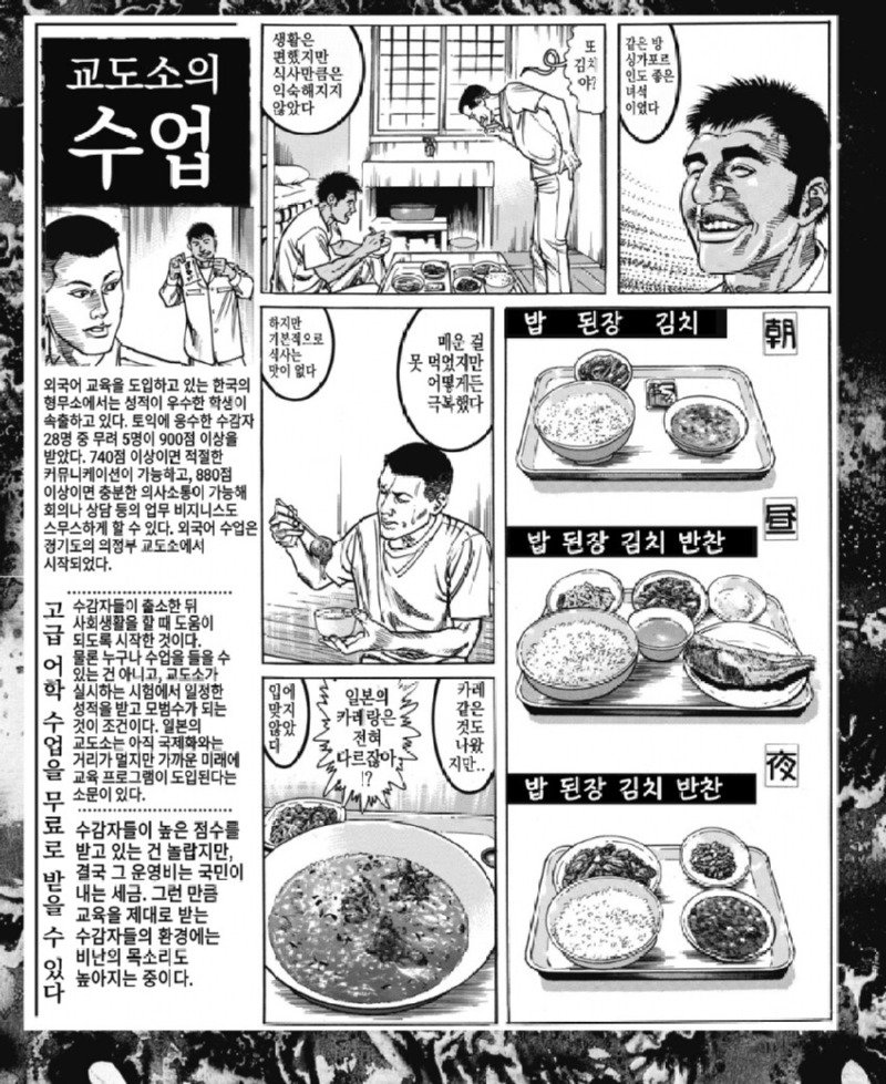 한국의 교도소는 자는 것만으로 형량이 끝나는 느긋한 시간을 보내는 곳으로 알려져 있다. 일본에서도 외국인 범죄가 증가하고 있지만, 일본인의 해외 범죄도 증가하고 있다. 일본의 형무소와는 크게 다른 형태의 교도소로 생각된다. 현재 한국에서는 영어보다 편한 외국어 교육을 도입하고 있으며, 성적 우수한 수감자들이 이 속출하고 있다. 토익을 응시한 수감자 5명 중 28명이 740점 이상을 받았다. 외국어 수업은 경기도 의정부 교도소에서 시작됐으며, 이제는 외국인 전용 교도소가 설립될 예정이다. 외국어 교육을 통해 수감자들의 사회생활을 돕고자 하는 것이다. 교도소는 일본과는 다르게 식사를 제공하며, 한국의 국가인권위원회는 사형폐지