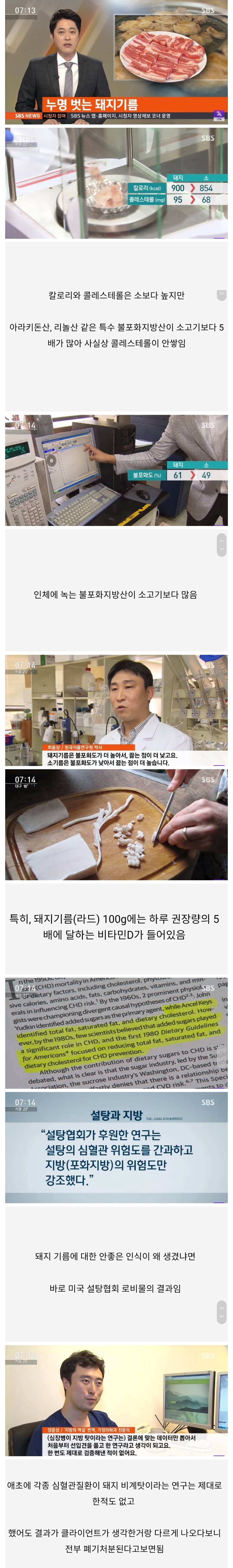 SBS NEWS의 시청자참여 코너인 SBS 뉴스 앱과 홈페이지를 통해 누명을 벗는 돼지기름에 대한 내용이 전달되었습니다. 돼지기름은 소고기보다 특수 불포화지방산인 아라키돈산과 리놀산이 더 많아서 콜레스테롤이 쌓이지 않는 것으로 알려져 있습니다. 또한 돼지기름은 불포화도가 높아서 끓는 점이 낮고, 소기름은 불포화도가 낮아서 끓는 점이 높다고 합니다. 그리고 돼지 소 각각의 칼로리와 콜레스테롤 수치도 소보다 높다는 내용이 언급되었습니다.