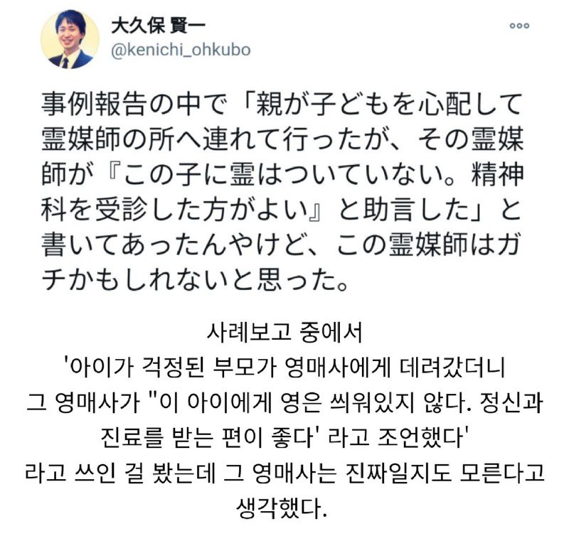 어떤 사례 보고서에는 "부모가 자녀를 걱정하고 영매사에게 데려갔는데, 그 영매사가 '이 아이에게는 영이 씌여있지 않다. 정신과를 받는 편이 좋다'고 조언했다"고 쓰여있었다. 나는 이 영매사가 진짜일지도 모른다고 생각했다. 사실, 실제로는 퇴치를 하는 영매사들도 있지만, 정신과도 같이 다녔다는 무당들도 있다는 글도 보았다. 이런 내용들은 창작물에서 캐릭터에 한 가지 요소로 넣어주면 몰입감이 올라간다는 것도 알고 있다. 그러면서도 무당에게 가서 어깨가 무거워서 상황을 말했더니 거북 목이라고 침 놔준다는 이야기를 떠올렸다.