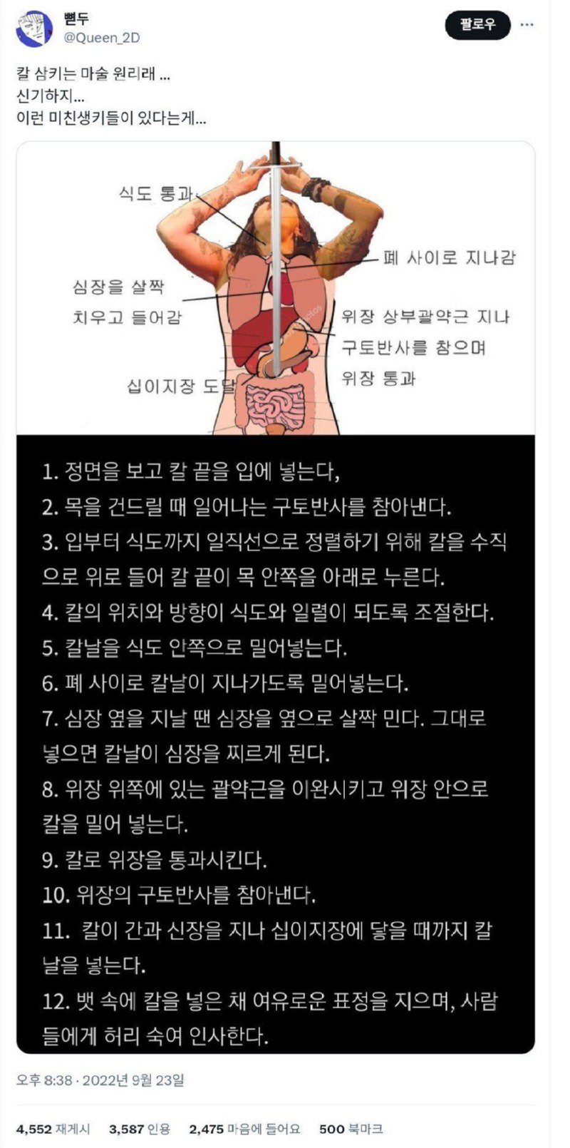 이 토론에는 여러 의견들이 나와있는데, 그 중에서도 @Queen_2D 님의 답글이 베스트1로 뽑혔다. 해당 답글에 따르면, 칼을 삼킬 수 있는 방법은 다음과 같다고 한다: