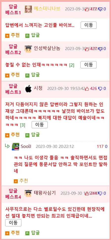 MZ세대와 요즘 말에 대한 생각을 물어봤을 때, 나는 일은 최대한 빼먹고 돈은 돈대로 받고 싶은 쓰레기 심보천이라고 답했다. 면접관은 다시한번 나에게 MZ세대므로서 그런 생각을 한 이유를 물었고, 나는 졸업 후 일밖에 안해봐서 그 쪽 감성에 공감하지 못했기 때문이라고 답했다.