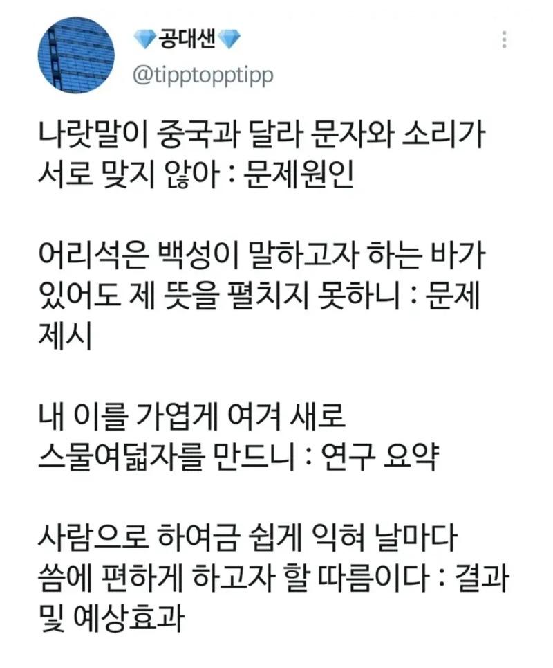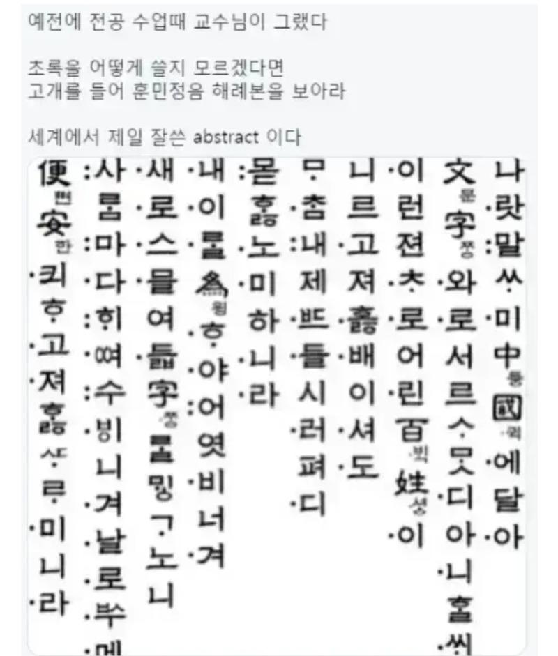 예전에 전공 수업 때 교수님께서 초록을 어떻게 써야 할지 모르겠다면 훈민정음 해례본을 보라고 하셨습니다. 그 해례본은 세계에서 가장 잘 쓰여진 abstract이라고 합니다. '便'이 새로 쓰인 글자인데, '사'와 '새', '내'와 '몯모니', '이'와 '룸'으로 이루어져 있습니다. '한'은 마스, '便'은 안전을 뜻하고, '고져스'는 미니라는 뜻입니다. '이룰'은 호야, 어엿비, 너겨 등으로 읽을 수 있습니다. '한여'는 구멍이나 틈 같은 것을 뜻하며, '메 노'는 내와 고전 쿨을 의미합니다. '홈'은 공대생을 의미하며, '미제져'와 '와 하'는 호, 로라는 뜻입니다. '니들배어' 서라시이린은 글을 정리해준 문장입니다.