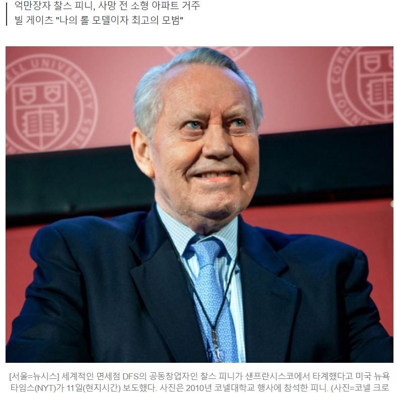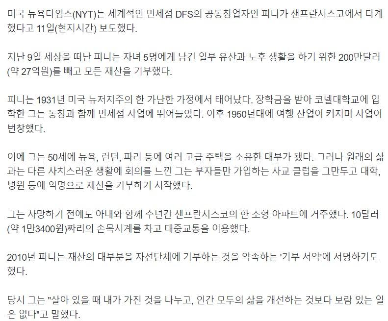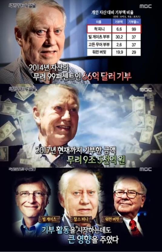 프로필: 찰스 피니, 세계적인 면세점 DFS의 공동창업자였으며 샌프란시스코에서 사망하였다. 피니는 자녀 5명을 제외한 모든 재산을 기부하였으며, 돈만 내고 끝나는 것이 아니라 도움의 책임을 끝까지 져야 한다고 말했다. 피니는 가난한 가정에서 태어나 동창과 함께 면세점 사업에 뛰어들고 성공한 후 부자들만 가입하는 사교 클럽을 그만두고 익명으로 재산을 기부하며 사치스러운 삶에 회의를 가지게 되었다. 그는 아내와 함께 소형 아파트에 거주하며 손목시계 10달러짜리를 차고 대중교통을 이용했다. 2010년에는 재산의 대부분을 자선단체에 기부하는 '기부 서약'을 서명하기도 했다.