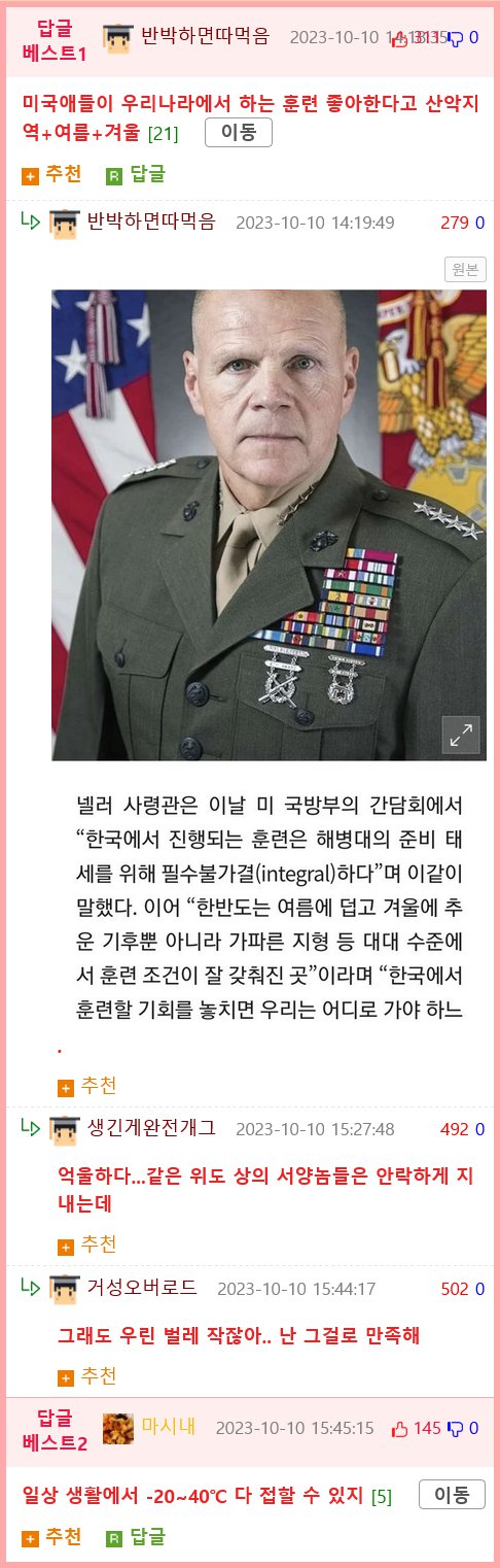 한국에서는 K-9가 잘 돌아간다고 합니다. 이에 대해 노르웨이는 우리나라가 추워서 사용이 어렵다고 이야기했고, 한국은 사용 가능하다고 반박했습니다. 그리고 이집트는 한국이 사막이라 매우 더워서 사용이 어렵다고 언급했지만 다시 한국은 사용 가능하다고 말했습니다. 다른 사람들과의 대화에서는 여름에는 남미에서 3-40도까지 올라가고 한국도 그정도라고 말한 것에 대해 한국인들이 눈동자 흔들린다며 거짓말하지 말라고 했습니다. 그리고 옷 정리에 대해 이야기하던 중 우리나라는 계절이 바뀔 때 옷을 정리하고 바꾼다는 것에 대해 신기해했습니다. 이어서 미국애들이 한국에서 하는 훈련을 좋아한다고 하고 한국에서 훈련 기회를 놓치면 어디로 갈 수 없다고 말했습니다. 마지막으로 일상 생활에서 한국에서는 -20~40℃의 온도를 경험할 수 있다고 이야기했습니다.