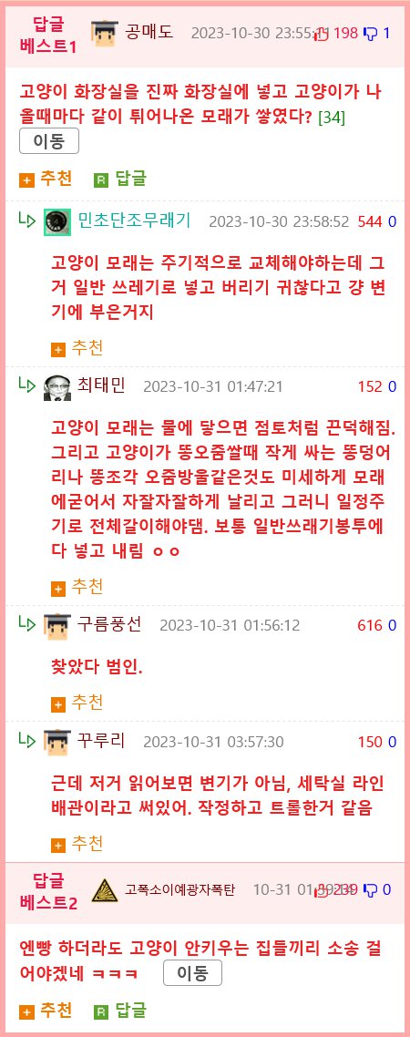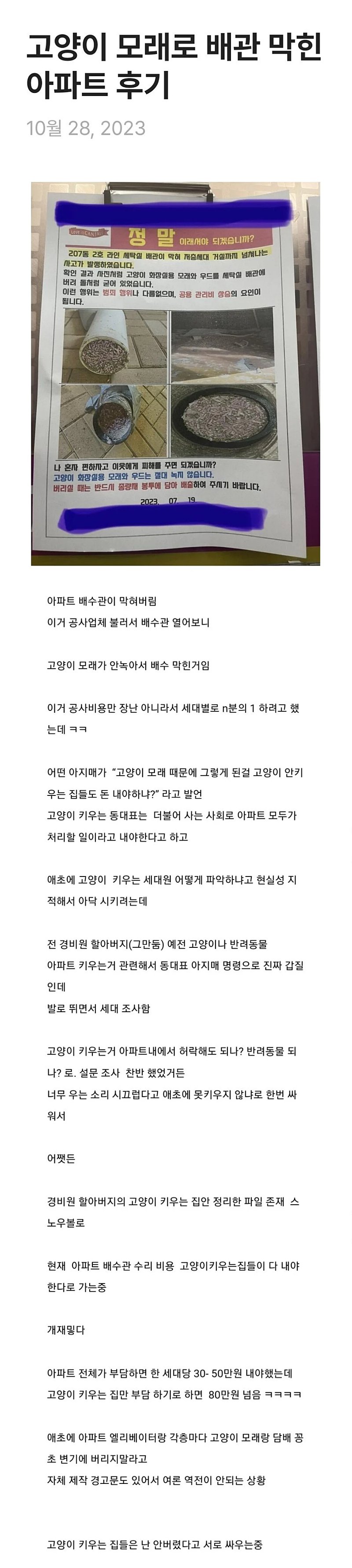 고양이 모래로 배관 막힌 아파트 후기