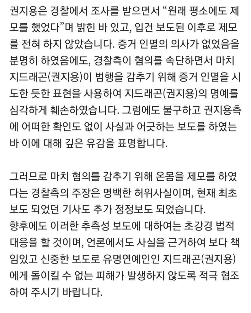 - 경찰이 제모를 증거 인멸을 위해 한 것처럼 보도된 것은 거짓이며, 권지용은 계속 긴 모발을 유지하고 있었고, 경찰 요청에 충분히 협조하여 모발도 임의로 제출하였습니다.