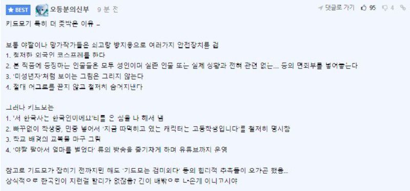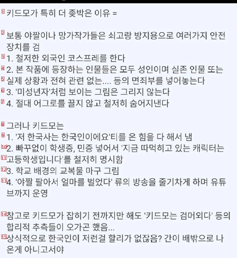 재심 절차를 거쳐 헌법소원이 진행 중인 상황에서, 키드모는 현재 징역 3년 (집유 4년)과 봉사사교육, 물건 압수조치를 받아야 할 것으로 예상됩니다. 키드모가 키즈 모델 포르노 중박에 이유가 있다고 강조되는 이유는 일반적으로 야짤이나 망가작가들이 쇠고랑 방지 목적으로 여러 안전장치를 사용하는데, 키드모는 철저한 외국인 코스프레를 하며 한국인으로 가장한 점, 미성년자로 보이는 그림을 그리지 않고 성인 캐릭터만 그리는 점 등이 있습니다. 또한, 키드모는 야짤을 팔아 수익을 올리고 류의 방송과 유튜브 운영까지 하며, 학교 배경 교복을 그림에 자주 사용한다는 점이 있었습니다. 이러한 이유로 키드모의 판결 이전까지는 검거되지 않았으며, 합리적인 추측들이 많이 오갔으나, 한국인이 이런 행동을 할 이유는 없다는 상식적인 판단이 있었습니다. 또한, 키드모의 작품에 등장하는 인물들은 모두 성인이며, 실제 상황과는 전혀 관련이 없는 등의 면죄부를 포함시키고, 미성년자처럼 보이는 그림은 그리지 않는 등의 조치를 취하고 있습니다. 키드모는 어그로를 끌지 않고 숨어지낸다는 점에서 다른 야짤 작가들과는 차별화되는 점도 있었습니다. 그러나 키드모는 "저 한국사는 한국인이에요"라는 티를 내며 철저히 자신을 감추지 않았으며, 학생증, 민증을 포함하여 자신이 그린 캐릭터들이 고등학생임을 명시하는 등의 행동을 했습니다. 이렇게 키드모는 어그로를 많이 끌어내었고, 야짤 작가로서 형량이 더 높다는 점에서도 주목받았습니다. 그러나 일반적으로 야짤 작가가 검거되면 오타쿠 커뮤니티에서는 난리가 나지만, 키드모의 경우는 대부분이 그를 비웃는 반응이었던 것으로 알려져있습니다. 키드모의 사례는 인터넷에서 야짤을 잡을 자원을 성범죄 예방에 투자하는 것이 더 효과적일지에 대한 생각을 자아내기도 합니다. 이와 더불어 법이 일부 이상하다는 의견도 제기되고 있습니다. 다른 유저들은 작가를 실드치며 작품에 면죄부를 포함시키고 있는데, 키드모의 경우는 비웃음이 대부분이었던 것으로 알려져있습니다. 이러한 의견들이 있으며, 키드모의 사례는 사람들간의 평가와 법에 대한 비판을 자아내고 있는 상황입니다.
