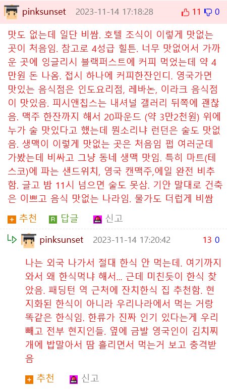 글에는 인생84와 영국 브이로그, 한국브이, PINKO TH, 영국 음식 등 여러 단어들이 등장한다. 영국에서는 음식이 핵노맛이라는 의견이 있고, 다이어트를 하기 좋은 곳이라는 주장도 나온다. 영국 비둘기들도 다이어트를 하고 있으며, 음식을 조금 맛없게 만들어 살을 빼는 방법으로 알려져 있다. 그러나 영국의 건축은 최고이며, 생맥주와 맥주, 인도요리점 등 맛있는 음식과 장소도 존재한다고 말하고 있다.