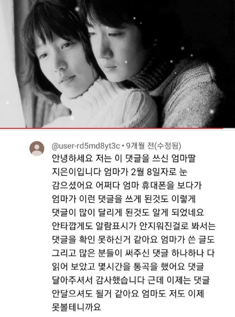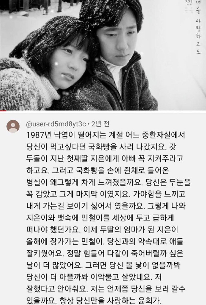 안녕하세요, 저는 최종예라고 합니다. 제 엄마는 2월 8일에 눈을 감으셨어요. 엄마의 댓글을 보게된 계기는 우연히 엄마의 휴대폰을 보다가였고, 그때 엄마가 많은 댓글을 받아오신 것을 알게 되었어요. 안타깝게도 엄마는 알람을 지우지 못한 상태였을 텐데, 아마 엄마는 제 댓글을 확인하지 못하셨을 것 같아요. 엄마가 쓴 글과 많은 분들이 남겨주신 댓글들을 하나하나 읽어 보았고, 몇 시간을 통곡하며 감사했습니다. 그러나 이제는 댓글을 달지 않아도 될 것 같아요. 왜냐하면 엄마도, 저도 이제는 댓글을 볼 수 없기 때문이에요. 이 글을 쓰는 저의 이름은 지은이라고 하고, 저는 행복한 학교의 진달래반에 다니고 있습니다. 76살인 엄마는 사랑하는 남편에게 벌세 20년이 되었어요. 남편은 사고로 먼저 떠나셨고, 그때 제가 갓 두 살이 되었을 때 엄마는 남편에게 "꼭 지켜주라"고 말하며 국화빵을 사러 나가셨어요. 그러고 이별 직전에 엄마는 병실에 들어오시면서 왜 그렇게 차갑게 느껴지는지 느꼈을 것 같아요. 그 순간 당신은 두 눈을 꼭 감으셨고, 그게 마지막이었어요. 아마 가야한다는 느낌 때문에 제게 가려고 하지 않았던 걸까요? 그렇게 엄마는 제와 민철이를 남기고 급하게 떠나야 했나요? 이제 제가 된 지은이는 두 딸의 엄마로서 장가를 가고 있는 민철이와 약속대로 아이들을 잘 키우고 있어요. 정말 힘들더라도 우리가 함께 모두 죽을까 봐 걱정이 되었어요. 그래서 더욱 더 당신을 아픈 모습으로 기억하고 싶지 않아서 살아왔어요. 저를 잘 한 거라고 안아 주세요. 그런데 저는 언제쯤 당신을 보러 갈 수 있을까요? 항상 당신만을 사랑하는 윤희가. 제가 답글을 작성하고 나서는 남편 생각으로 말없이 울었습니다. 이제 혼자 자식들과 살 생각을 하니 참기가 막히더라고요. 밥 달라는 자식들을 굶기는 할 수 없어서 살아왔습니다. 이 글을 보면서 마음이 다시 보고 싶어져 왔습니다. 여보, 저는 애들을 다 결혼시켰어요. 고생했다고 한 번만 말해줘요. 오늘따라 당신이 너무 보고 싶어요. 이런 힘든 삶에서 서로 의지하던 부부의 사별은 정말 마음 아픈 일이에요. 두 분이 다시 만나 행복한 시간을 보내길 바래요. 너를 사랑하고도 너를 보고 싶어.