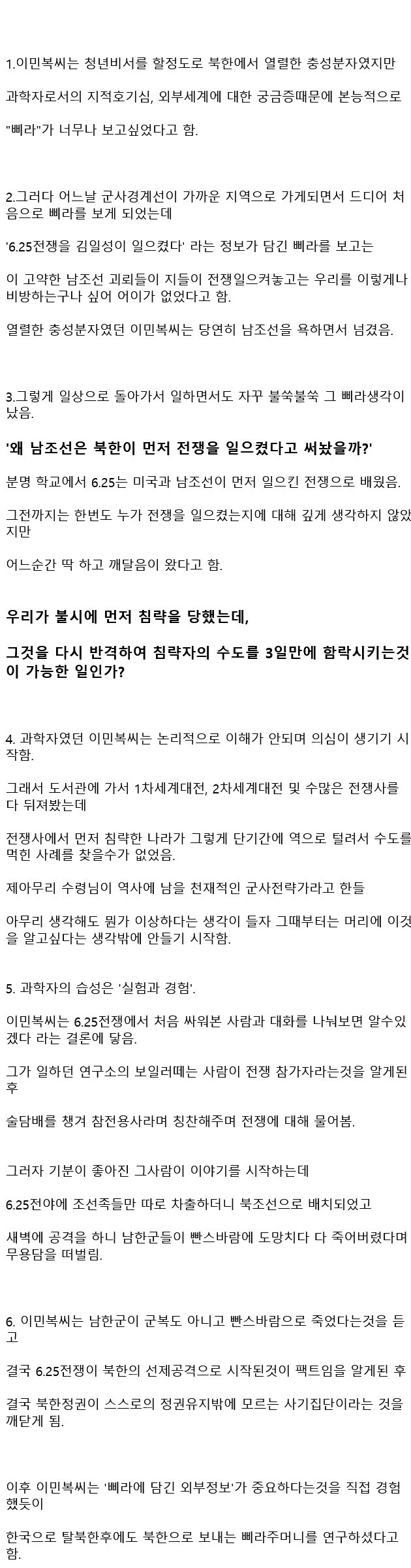 이민복은 북한에서 열렬한 충성을 보여줬지만, 외부세계에 대한 호기심 때문에 남조선을 비난하며 삐라를 보기를 간절히 원했었다. 어느날 군사경계선이 가까운 지역으로 이동하게 되면서 드디어 삐라를 보게 되었다. 그 삐라에는 6.25전쟁을 김일성이 일으켰다는 정보가 있어 이에 대해 남조선의 비방에 대한 어이없음을 느꼈다. 그 후에도 삐라에 대한 생각이 계속해서 떠올라 궁금증이 생겼고, 과학자적인 논리로 사건을 분석해보았다. 하지만 전쟁사에서 먼저 침략한 나라가 존재하지 않았기에 북한의 선제공격에 대한 의문이 생겼다. 이를 통해 북한정권의 사기집단이라는 결론에 도달했고, 한국으로 탈북한 이후에도 삐라주머니를 연구하게 되었다. 습성이었던 실험과 경험으로 고려해보면, 6.25전쟁의 참전자와 대화를 나누었다. 그 중 한 사람은 남한군이 빤스바람으로 죽었다는 이야기를 전하며 북한의 선제공격으로 시작되었음을 알게 되었다. 그 결과로 북한정권의 정체성에 의문이 생기고, 이후에는 한국으로 탈북한 이후도 삐라주머니를 연구하기 시작했다. 하지만 댓글에서는 다른 의견들이 나타나며, 정치적인 입장에 따라 사실을 해석하는 것에 대한 논쟁이 이루어졌다. 그렇게 이민복은 북한정권에 대한 의구심을 품고 연구를 진행하게 되었다.