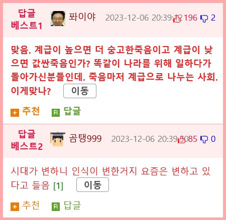 하지만 정말 이런 계급 구분으로 죽음까지 차별을 받는 것인가요? 정말 엿같은 제도라고 생각됩니다. 맞아요, 모두가 나라와 국민의 안전을 위해 일하다가 사망한 것인데 말이죠. 계급이 높으면 더 귀하고 숭고한 죽음이라는 건가요? 계급이 낮으면 가치가 떨어진다는 건가요? 정말 비난스러운 상황입니다. 사회에 드러난 이런 문제를 정말로 바꿔야 할 것 같습니다.