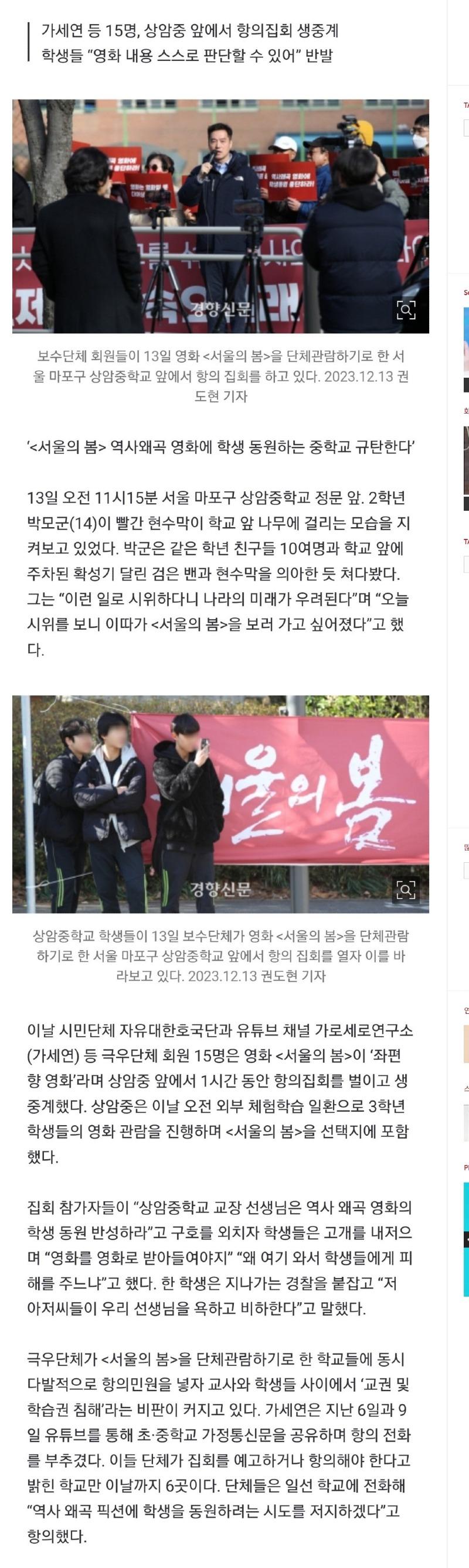 상암중학교에서 극우단체 회원 15명이 '서울의 봄' 영화 단체관람을 위한 항의 집회를 열었다. 학생들은 이 영화를 좌편향 영화로 비판하며 극우단체의 행동에 반발했다. 집회 참가자들은 영화 내용을 스스로 판단할 수 있는 권리를 주장하는 반면, 학생들은 영화를 영화로 받아들여야 한다는 의견을 제시했다. 이에 대해 한 학생은 경찰에게 극우단체 회원들의 비방에 대해 불평을 했다. 이러한 상황에서 학생들은 극우단체 회원들로 인해 피해를 입는 것을 우려하고 극우단체 회원들은 영화 내용의 왜곡을 비난하며 상암중학교 교장 선생님에 대한 반성을 요구했다.